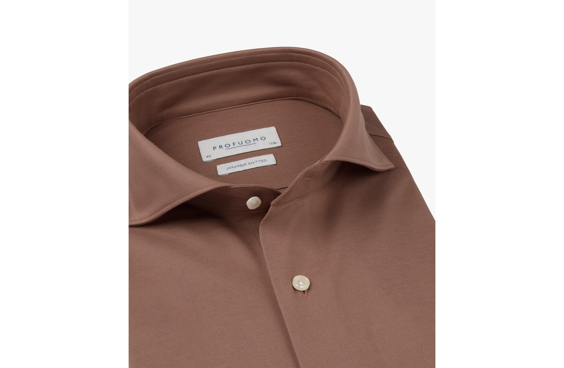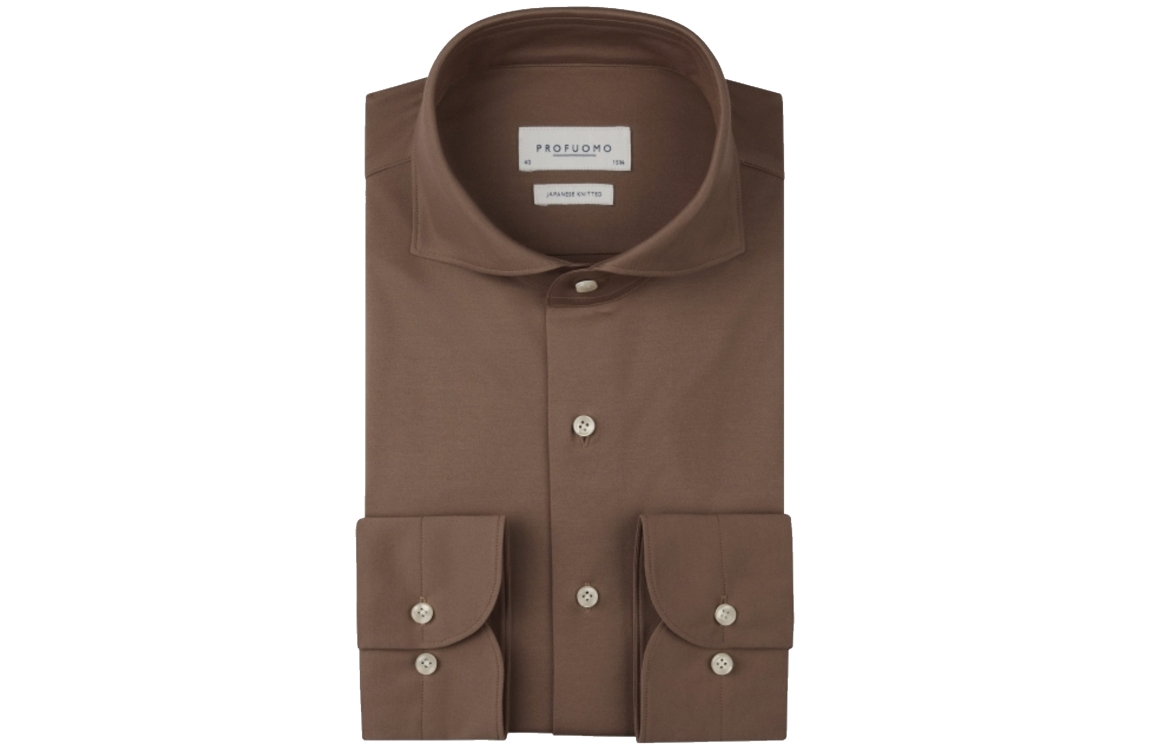 Profuomo overhemd PPXH10032M. Dit slim fit model is voorzien van een cutaway kraag en heeft lange mouwen afgewerkt met een split en knopen. Dit terra kleurige overhemd van Profuomo sluit aan de voorzijde door middel van knopen. Dit model is uitgevoerd in een 'japanese knit' stretch kwaliteit.