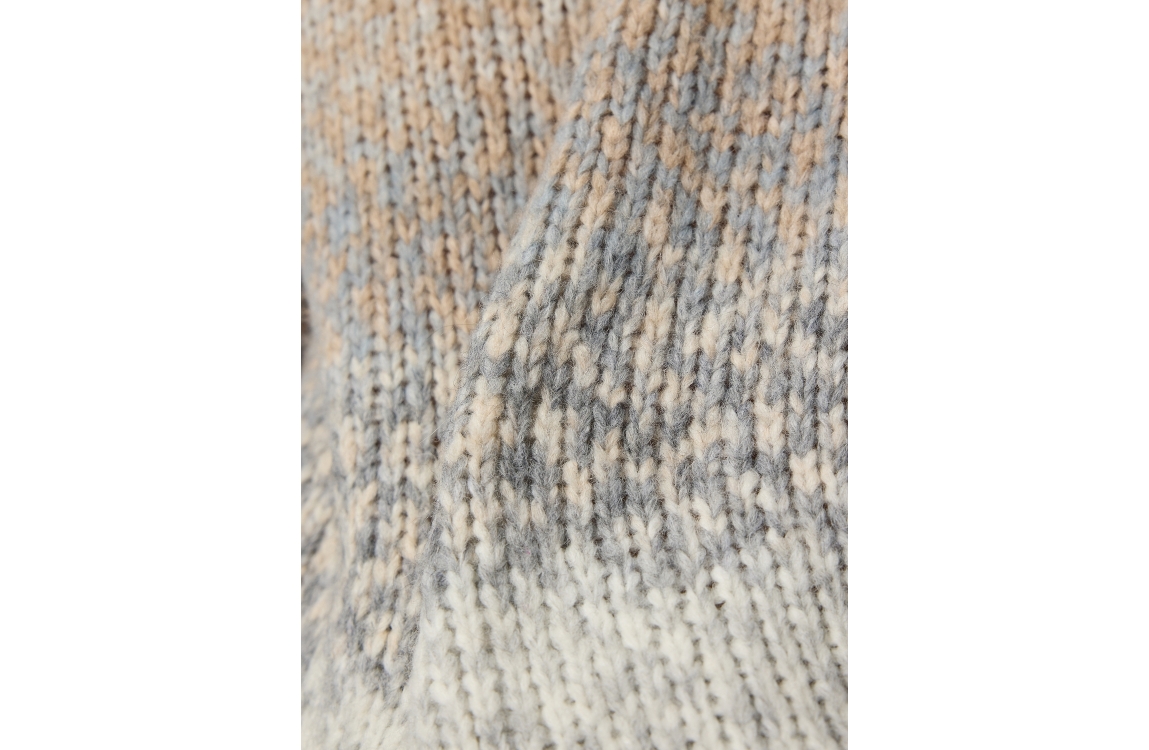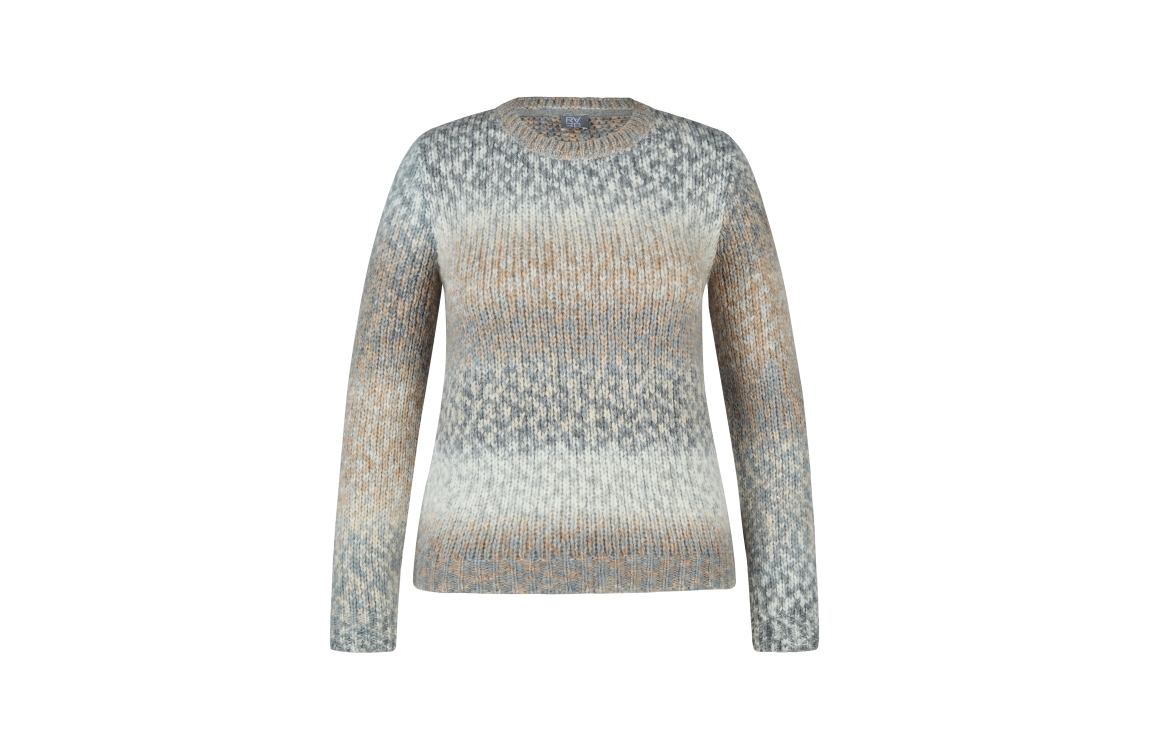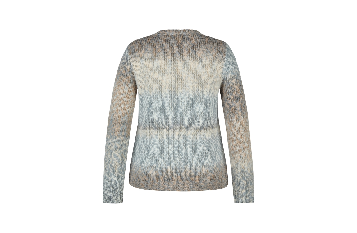 Rabe trui 55-221612. Dit rechtvallende model heeft een ronde hals en lange mouwen. Deze grijze trui van Rabe is bewerkt met een grafisch patroon.