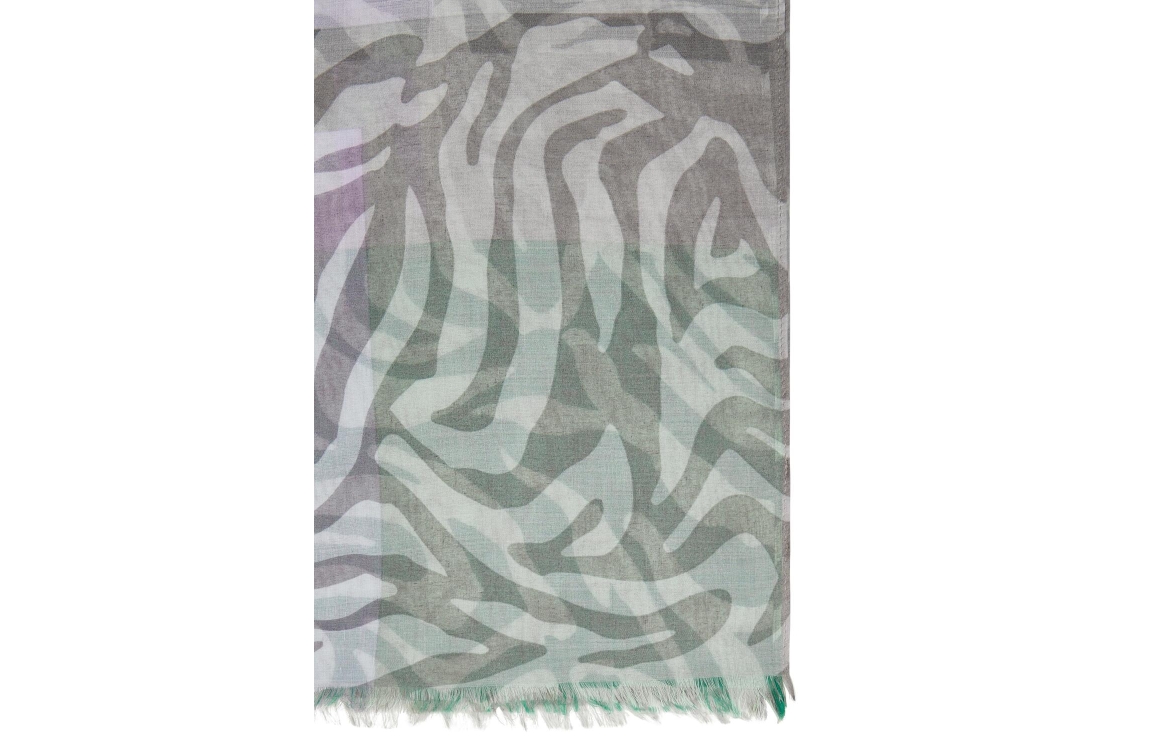 Rabe sjaal 51-124940. Dit langwerpig model is bewerkt in verschillende printen in verschillende kleuren. Deze multi colour sjaal van Rabe is afgewerkt met rafeldetails.