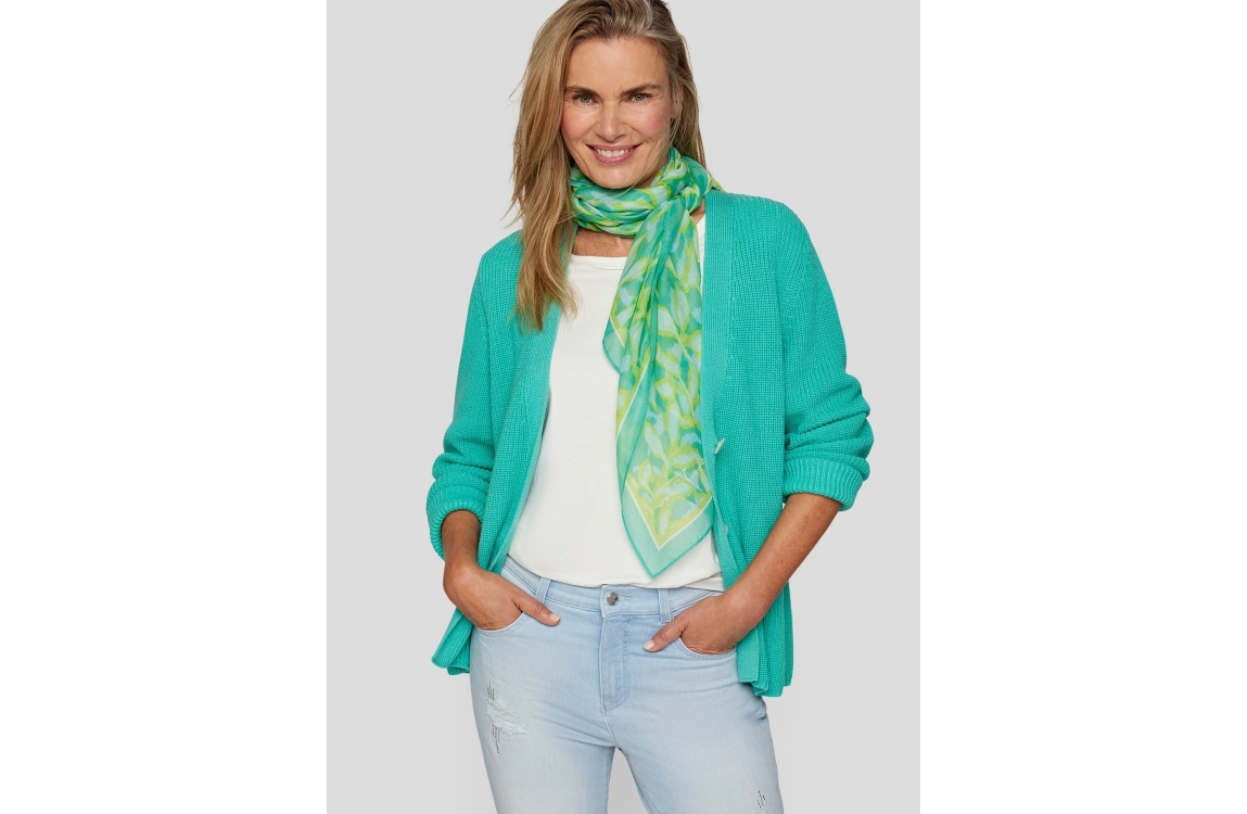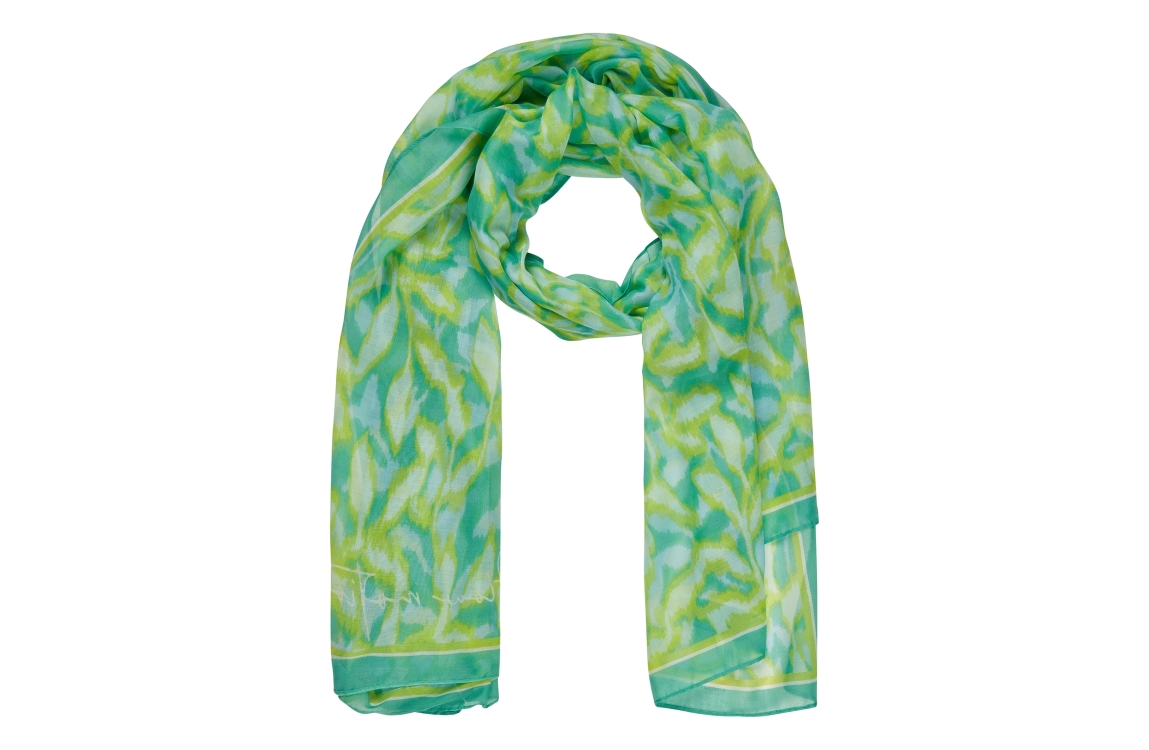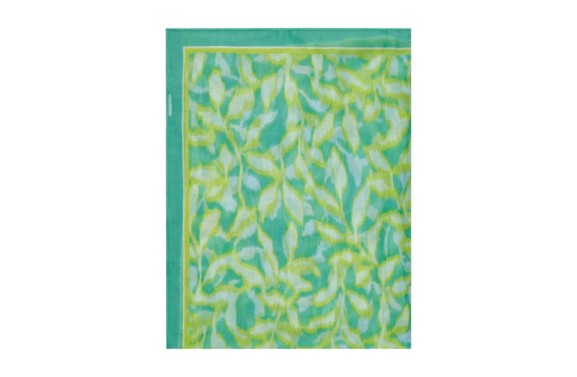 Rabe sjaal 54-211940. Dit rechthoekig model is bewerkt met groene bladprint.