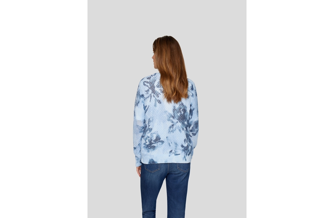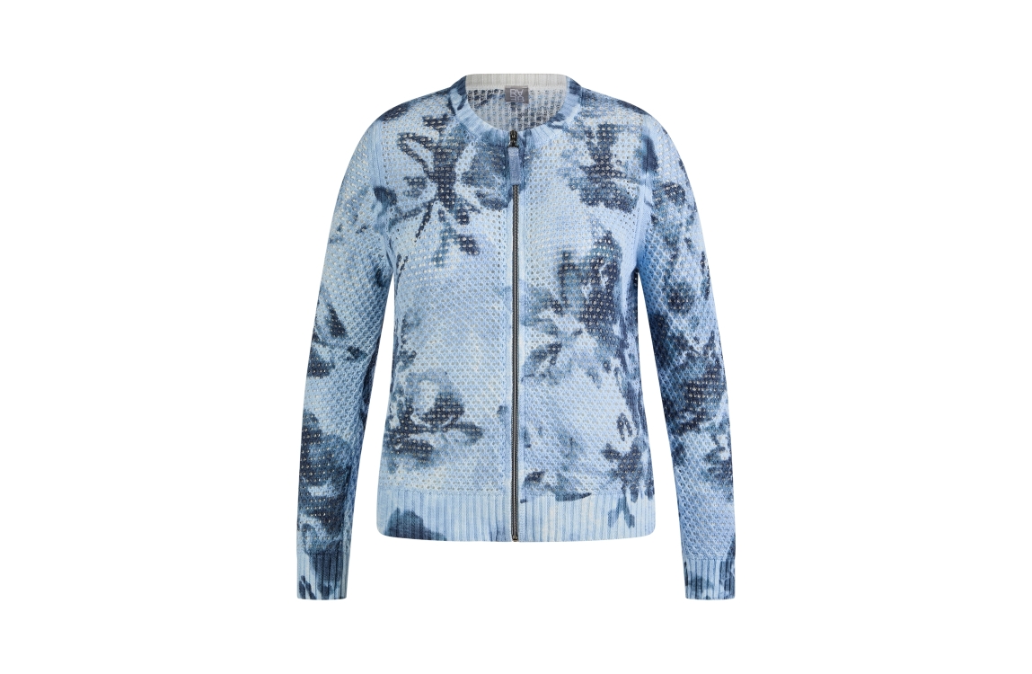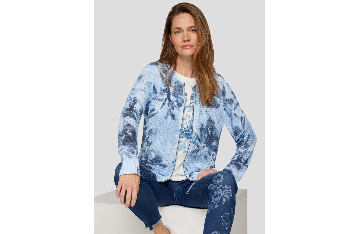 Rabe Online vest 54-213521. it rechtvallend model heeft een ronde hals en lange mouwen. Dit blauwe vest van Rabe sluit aan de voorzijde door middel van een rits en beschikt over een ribboord aan de onderzijde. Het opengewerkte vest is bewerkt met een all-over print.