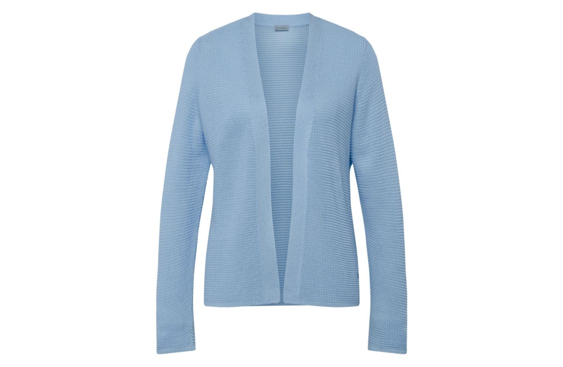 Rabe Strickjacke 6333 Ozean. Dit rechtvallende model is open aan de voorzijde en heeft driekwart mouwen. Dit blauwe vest van Rabe is uitgevoerd in een gehaakt materiaal.