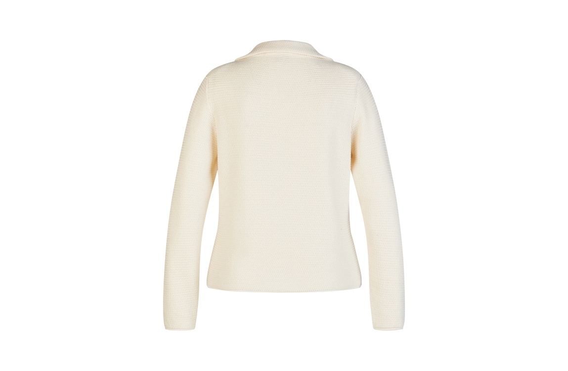 Rabe vest Alabaster 56-115554. Dit rechtvallend model is voorzien van een reverskraag en heeft lange mouwen afgewerkt met schoudervulling. Deze crèmekleurige vest van Rabe sluit door middel van knopen.