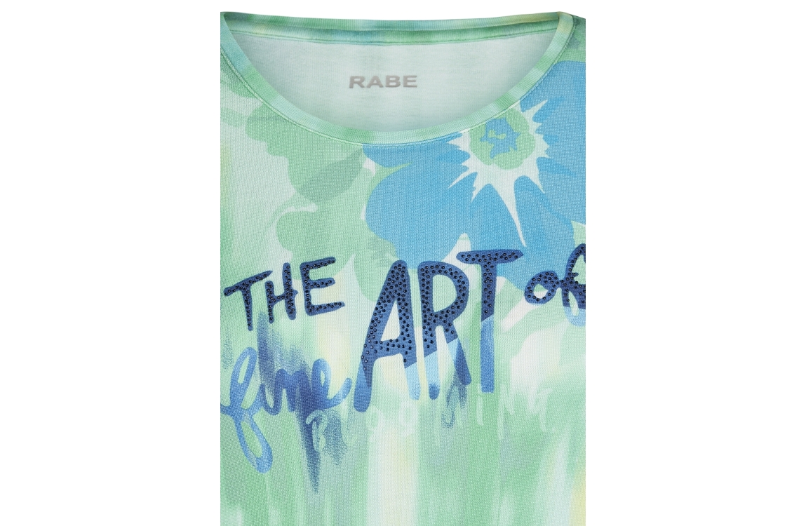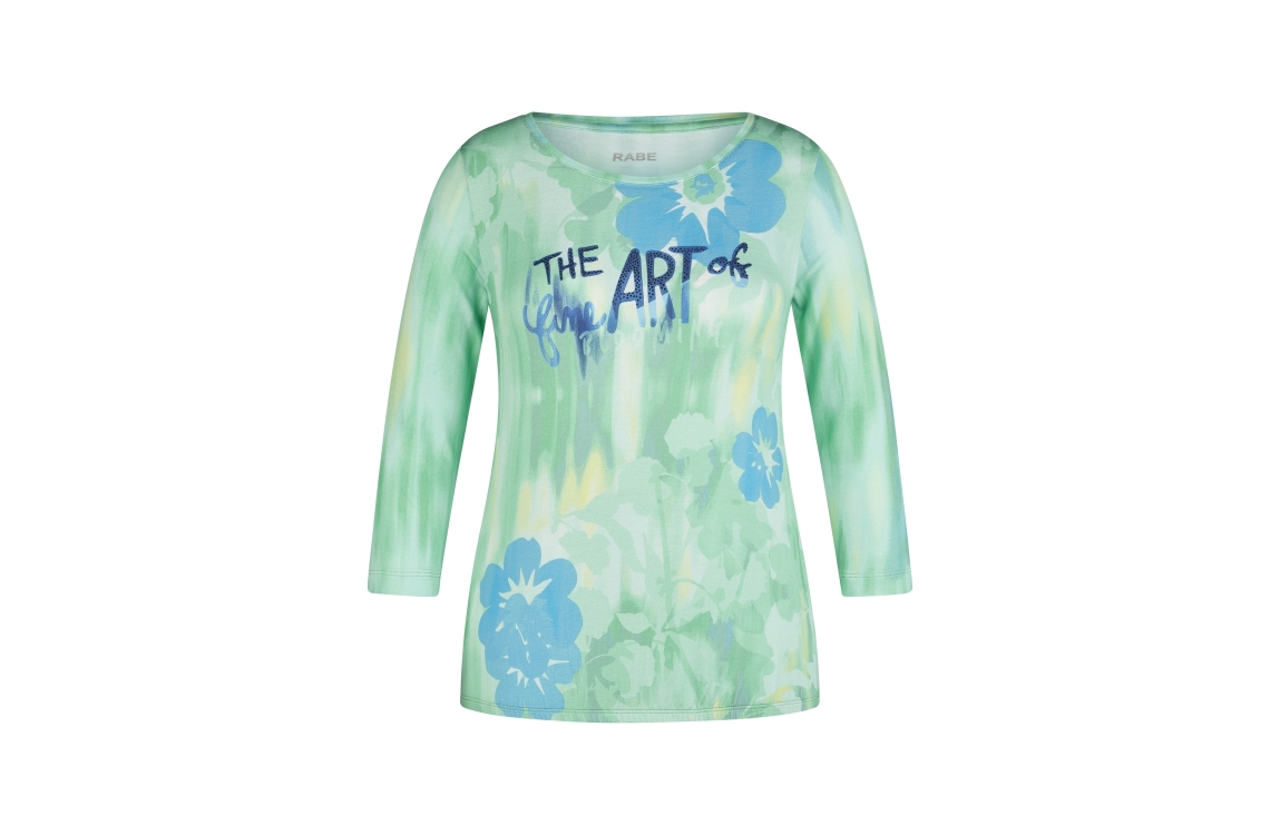 Rabe T-shirt 52-114355. Dit rechtvallend model is voorzien van een ronde hals en heeft driekwart mouwen. Deze groene t-shirt van Rabe is bewerkt met een tekstopdruk aan de voorzijde en is aan de onderzijde afgewerkt met een elastische boord.