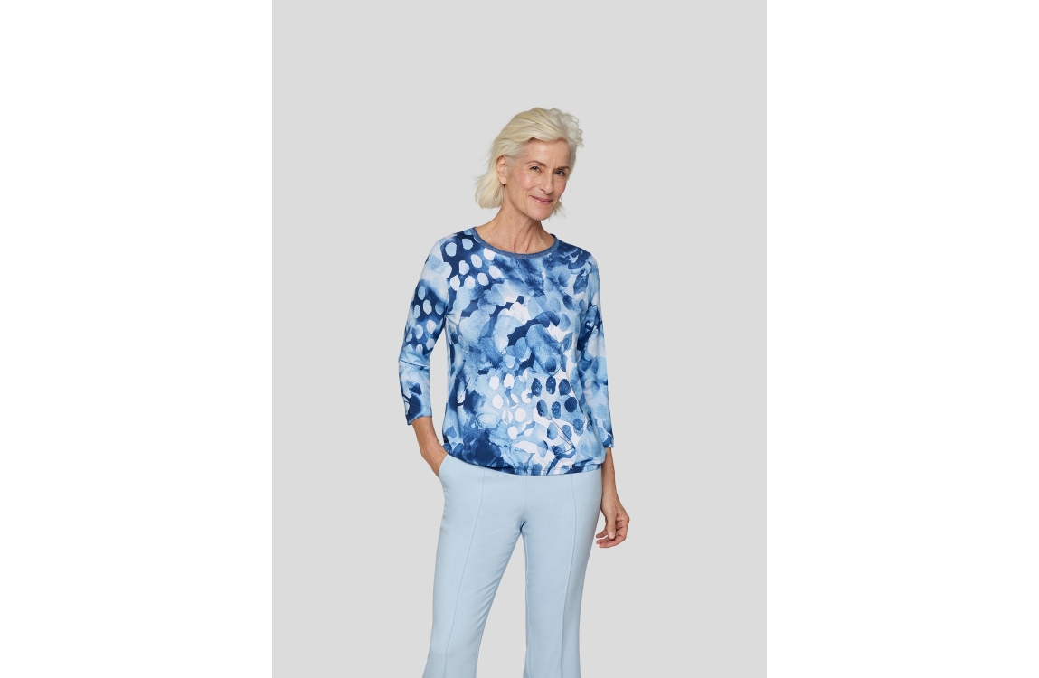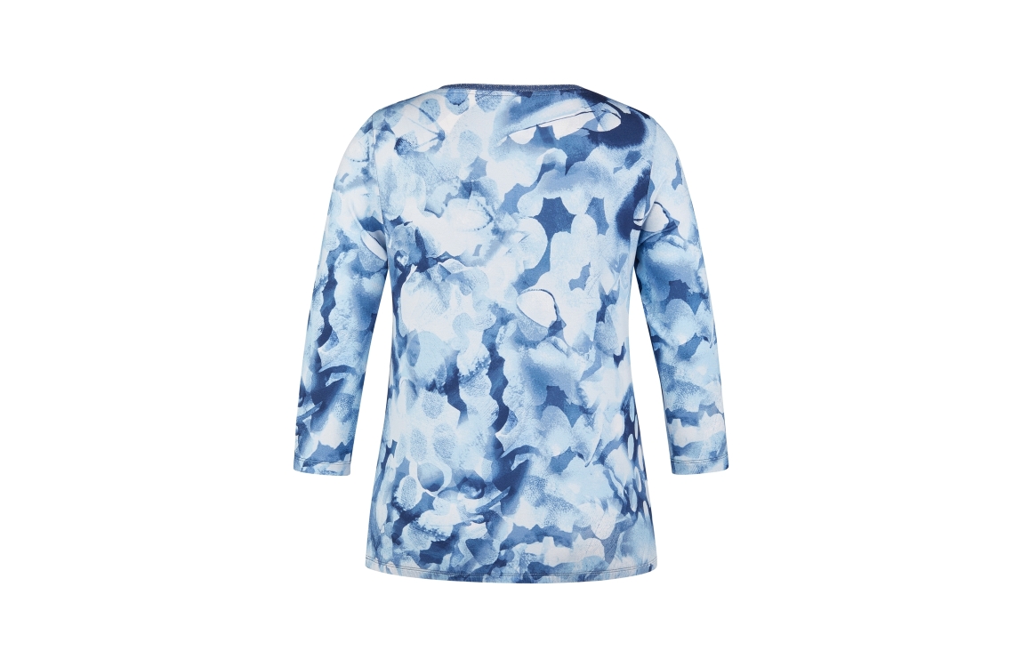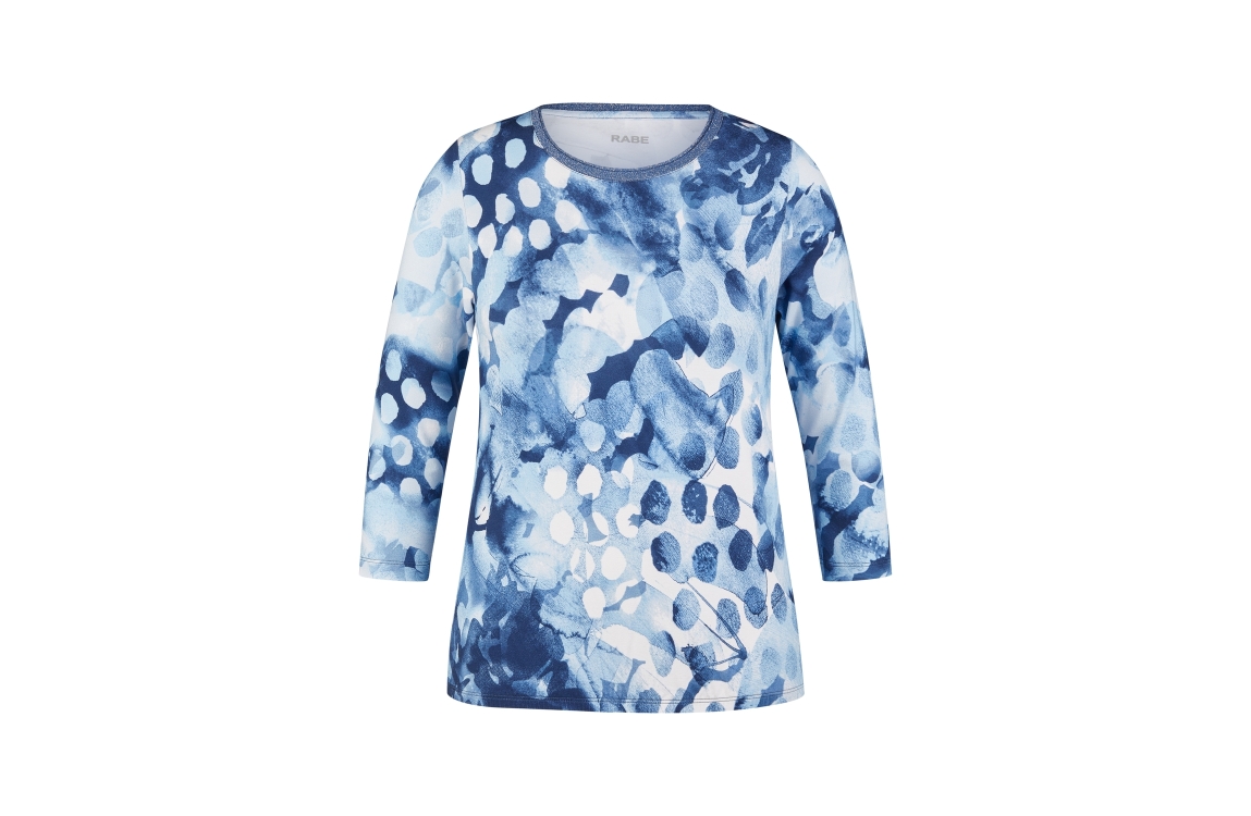 Rabe Online t-shirt 54-113352. Dit rechtvallende model is voorzien van een ronde hals en driekwart mouwen. Dit blauwe t-shirt is bewerkt met een all-over print en heeft aan de onderzijde een elastische boord.