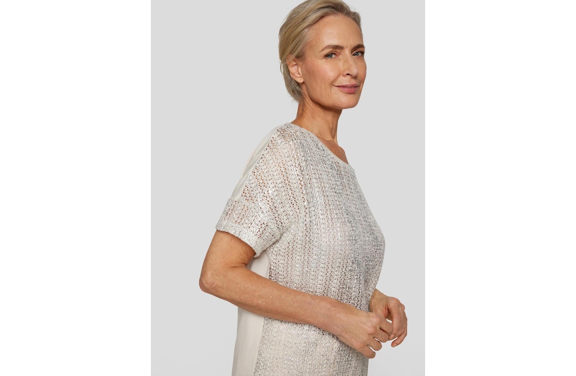 Rabe Online t-shirt 54-224304. Dit rechtvallende model heeft een ronde hals en korte mouwen. Dit beige t-shirt van Rabe heeft een doorzichtige voorzijde en is afgewerkt met een zilveren glitter.