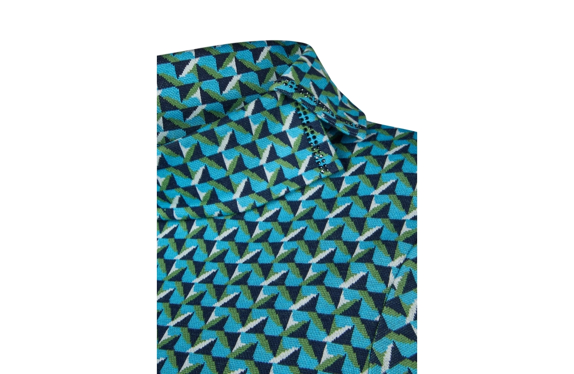 Rabe shirt 55-123362 5374. Dit rechtvallende model heeft een col, gedetailleerd met een splitdetail en strass-steentjes en beschikt over driekwart mouwen. Deze donkerblauwe shirt van Rabe is all-over bewerkt met een grafische print in verschillende kleuren en bevat lichte stretchkwaliteit.