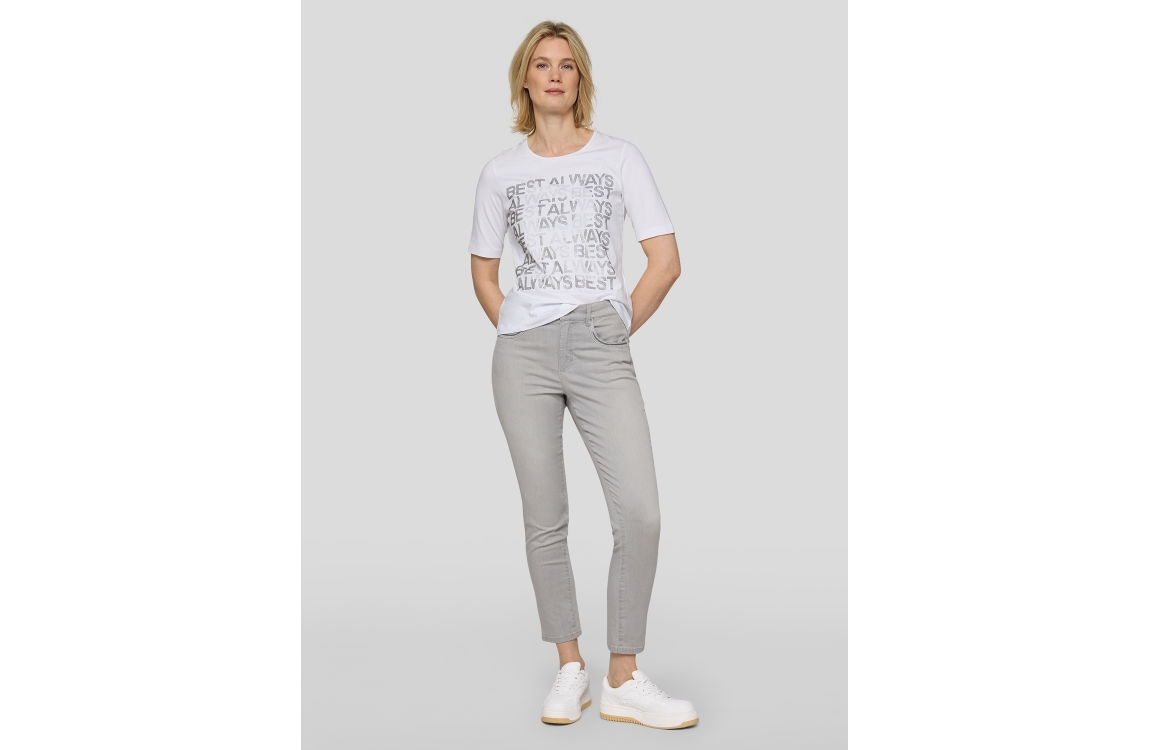 Rabe T-Shirt 6003 weiss. Dit rechtvallende model is voorzien van een ronde hals en heeft korte mouwen. Dit witte T-shirt van Rabe is bewerkt met een teskt opdruk van strass steentjes op de voorzijde.
