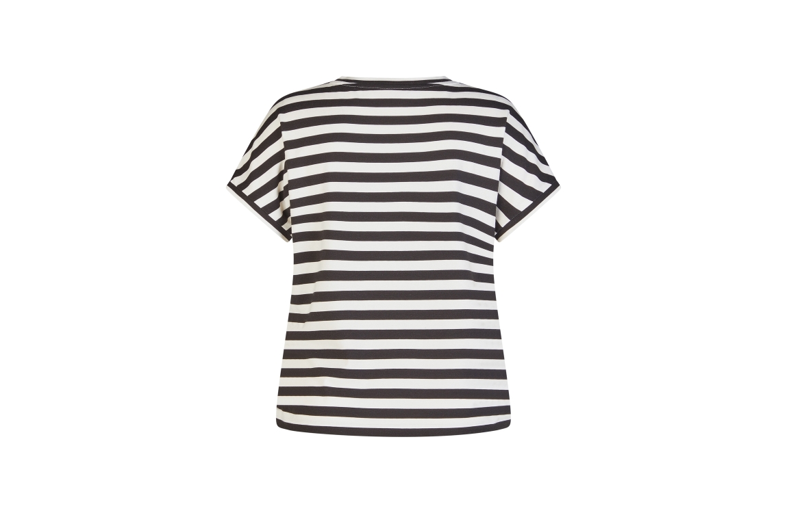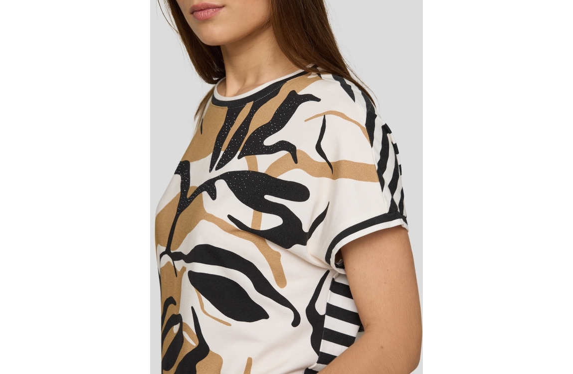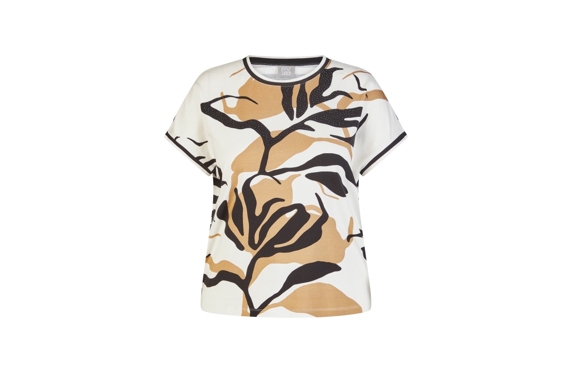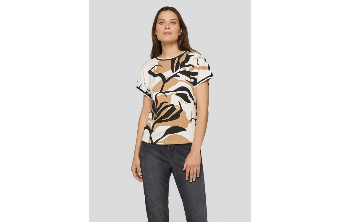 Rabe T-shirt 56-115352. Dit rechtvallend model is voorzien van een ronde hals en heeft korte mouwen. Deze crèmekleurige T-shirt van Rabe is aan de voorzijde bewerkt met een bloemenprint afgewerkt met strass steentjes en aan de achterzijde bewerkt met een streepprint.