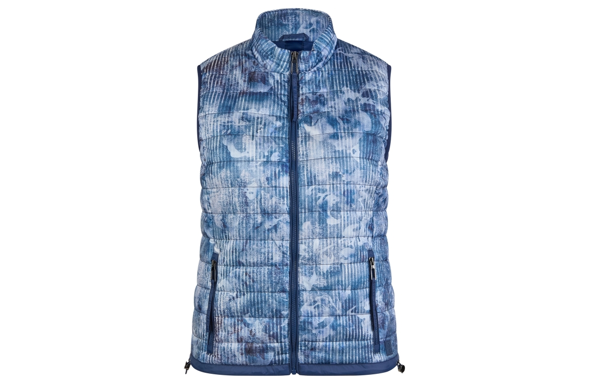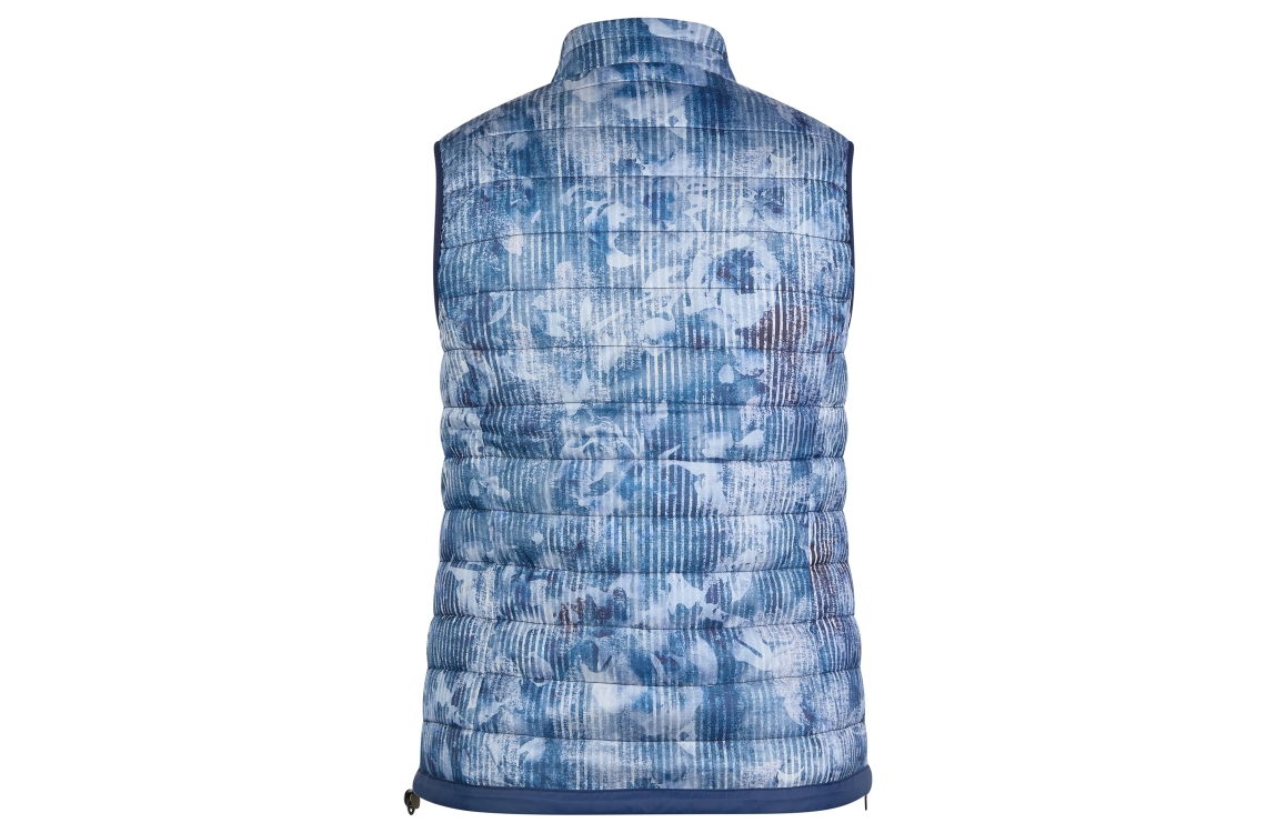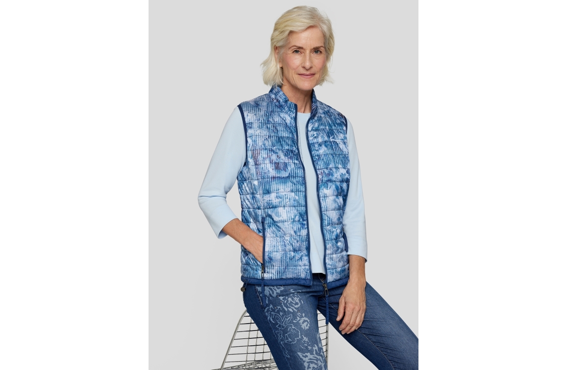Rabe Online bodywarmer 54-213871. Dit rechtvallende model is voorzien van een ronde hoge hals en is mouwloos. Deze lichtblauwe bodywarmer van Rabe Online sluit aan de voorzijde door middel van een rits en heeft twee zakken aan de voorzijde die ook sluiten met een rits. Dit model is bewerkt met een all-over print