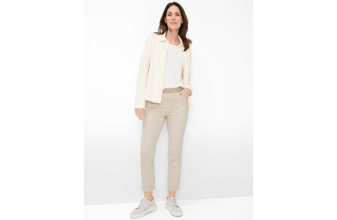 Raphaela by Brax broek 10-3520 10878620 56. Dit regular fit model sluit door middel van een elastische boord. Deze zandkleurige broek van Raphaela by Brax is all-over bewerkt met een grafische print en is uitgevoerd in een 5-pocket model.