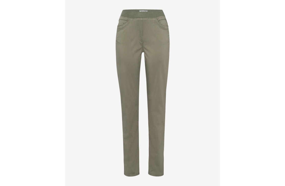 Raphaela by Brax broek 11-1558 10918620 Pamina. Dit aangesloten model sluit door middel van een elastische band. Deze legergroene broek van Brax is voorzien van twee steekzakken op het voor- en achterpand.