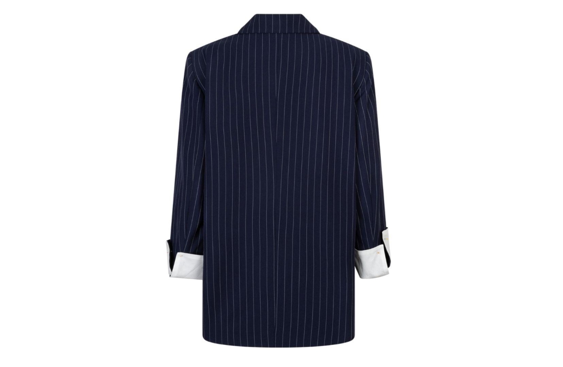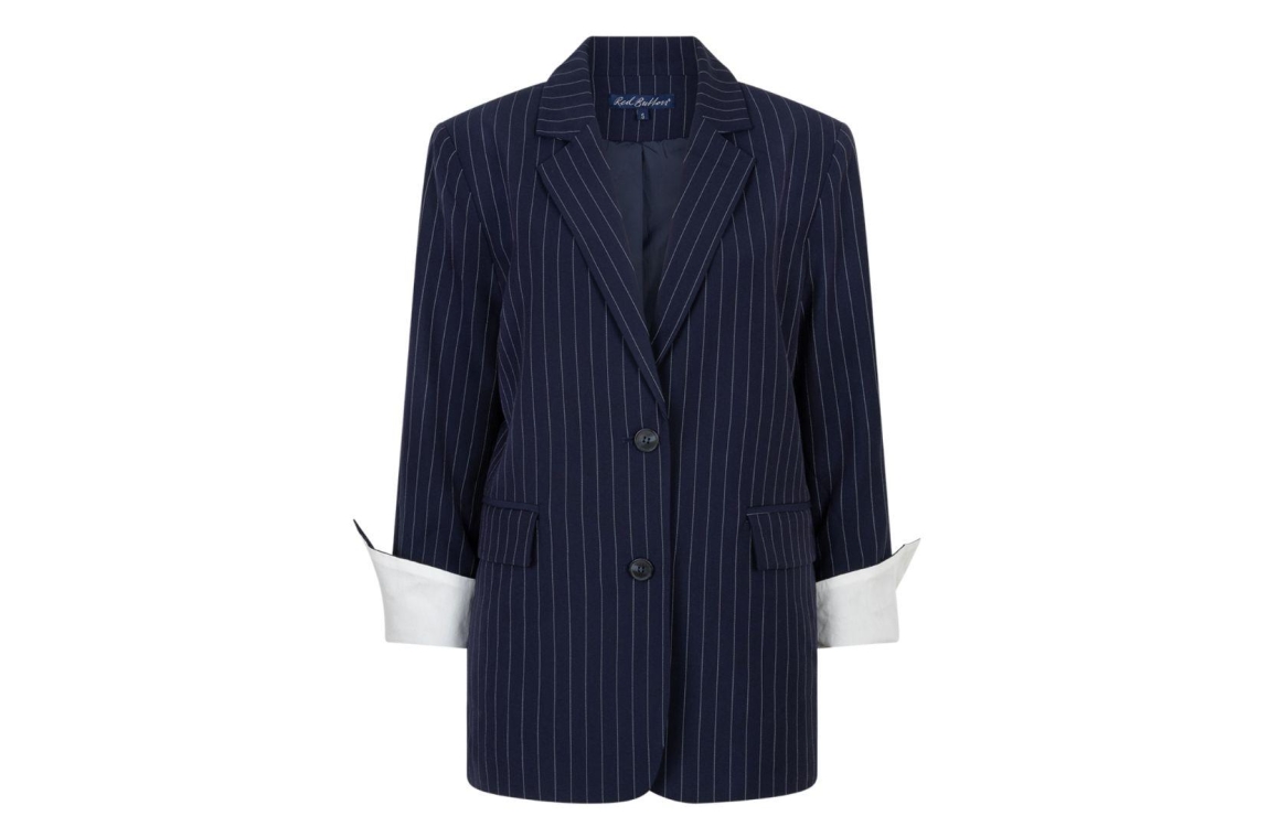 Red Button blazer Palazzo SRB4943. Dit oversized model is voorzien van een reverskraag en heeft lange mouwen. Deze donkerblauwe blazer van Red Button sluit door middel van knopen en beschikt over twee klepzakken. Dit model is all-over bewerkt met een krijtstreep.