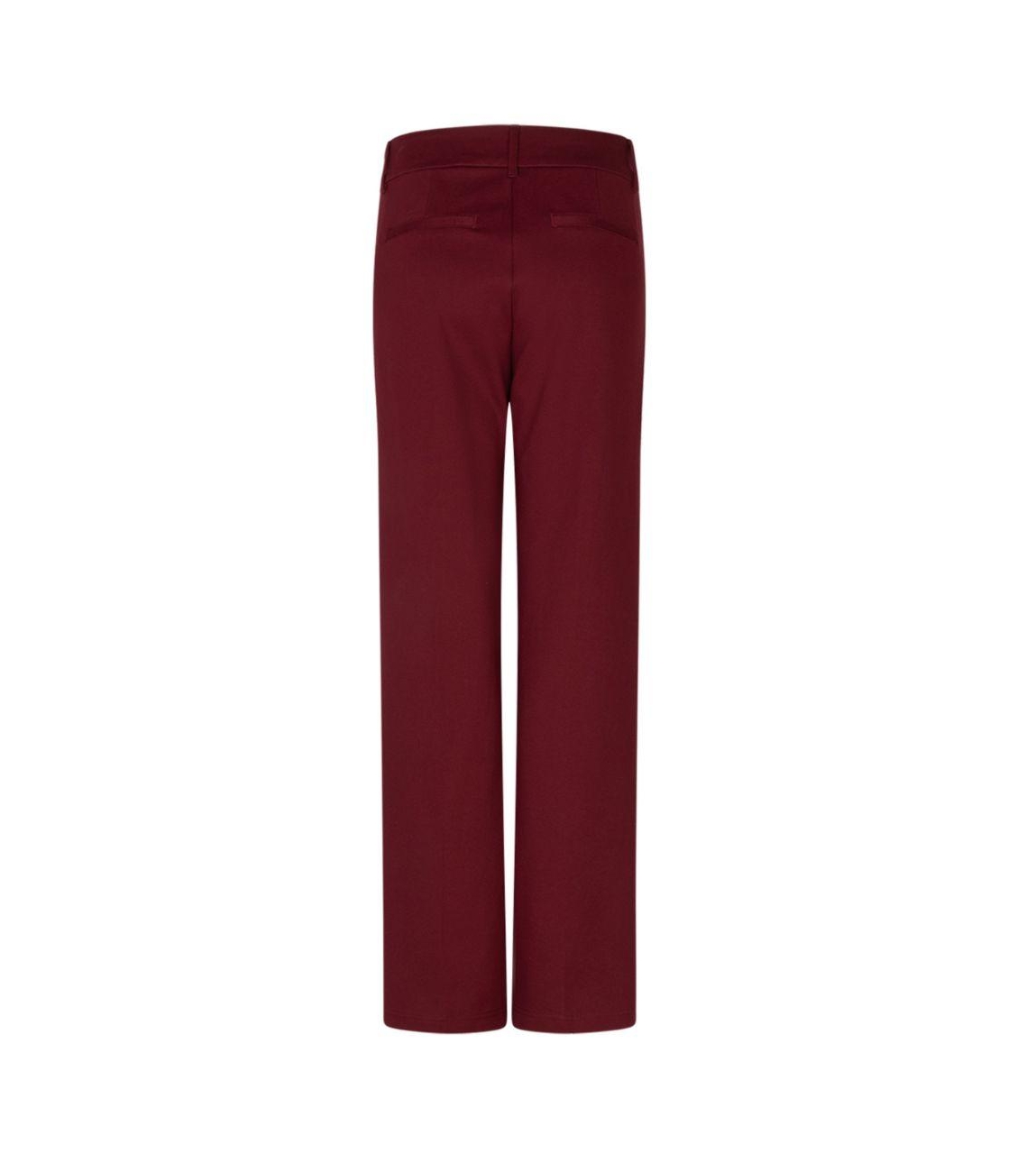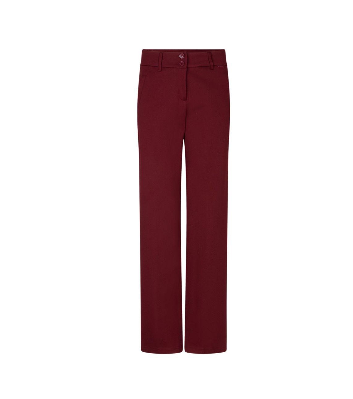 Red Button broek SRB4664. Dit wide leg fit sluit door middel van een knoop en rits afgewerkt met ceintuurlussen. Deze bordeauxrode broek van Red Button is voorzien van twee steekzakken met rits aan de voorzijde en twee paspelzakken aan de achterzijde.