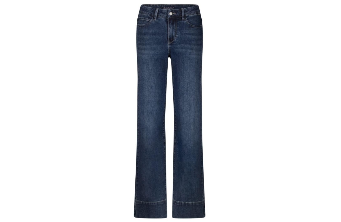 Red Button jeans Claudette SRB4588. Dit wide leg model sluit door middel van een knoop en rits en is afgewerkt met ceintuurlussen. Deze donkerblauwe jeans van Red Button is uitgevoerd in een 5-pocket model en bewerkt met een brede zoom aan de onderzijde.
