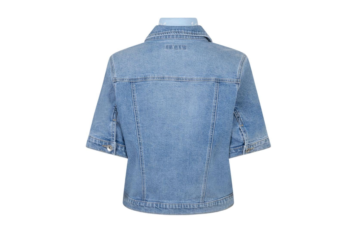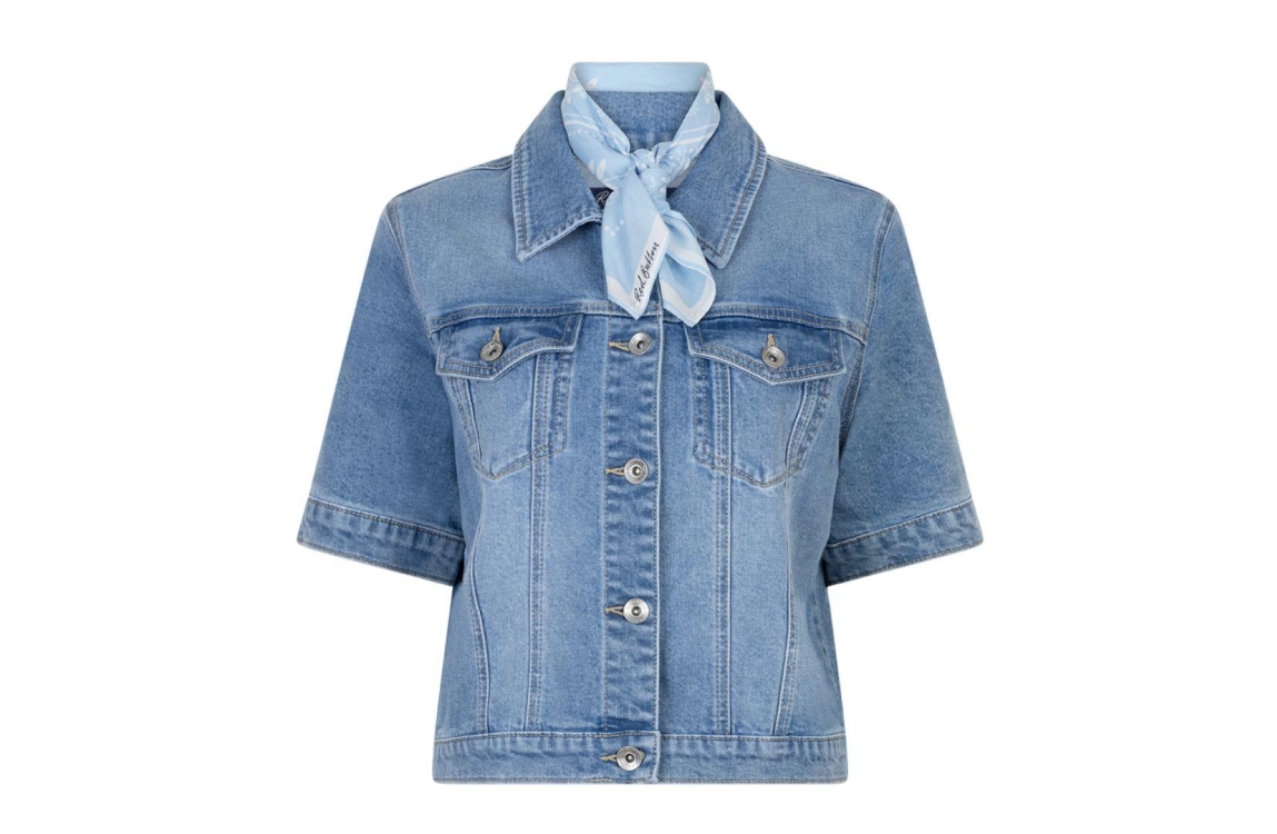Red Button Jackie short sleeve & bandana SRB4834. Dit rechtvallend model is voorzien van een kraag en heeft korte mouwen. Dit denim jasje van Red Button sluit door middel van knopen en beschikt over twee klepzakken.