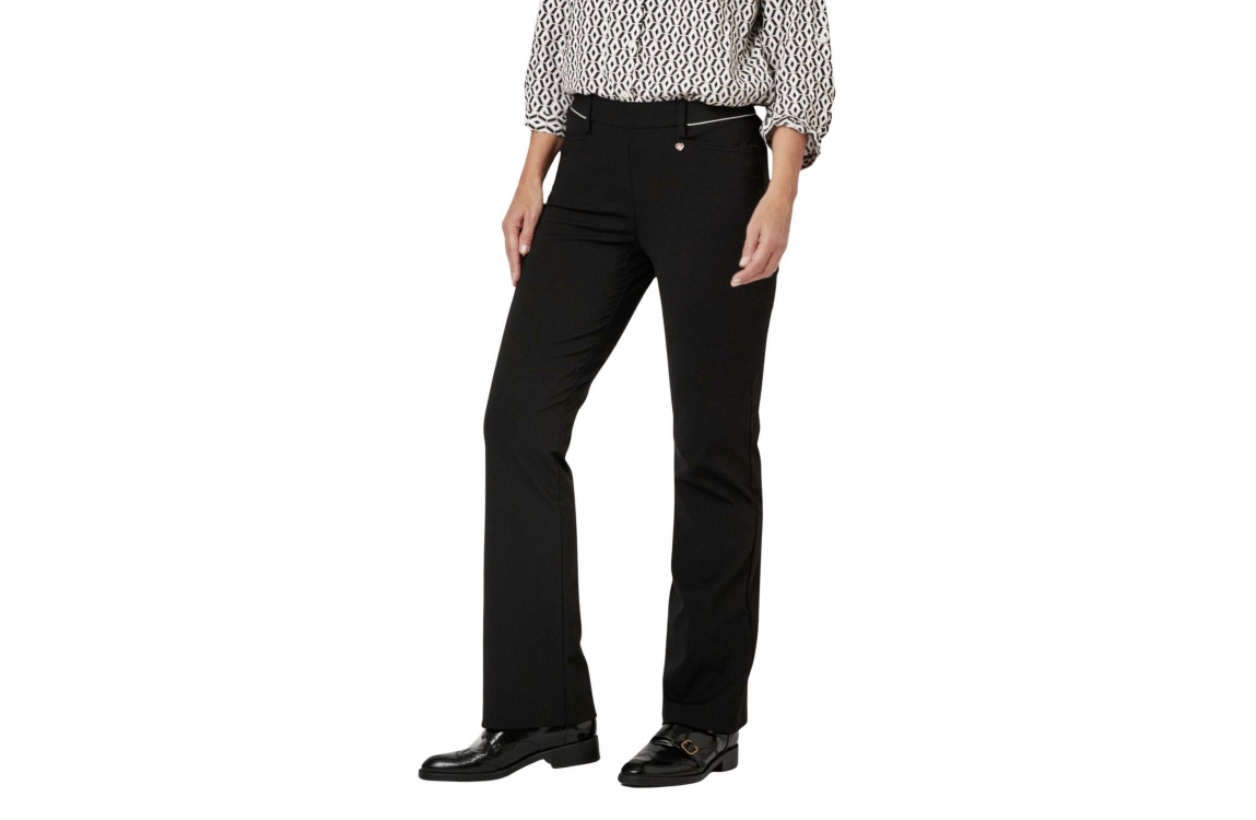 Relaxed by Toni broek 61-16/2855-18. Dit flared fit model sluit door middel van een elastische boord, gedetailleerd met witte omlijning en is voorzien van ceintuurlussen. Deze zwarte broek van Relaxed by Toni beschikt over twee steekzakken aan de voorzijde en is uitgevoerd in stretchkwaliteit.