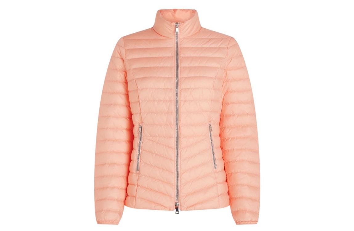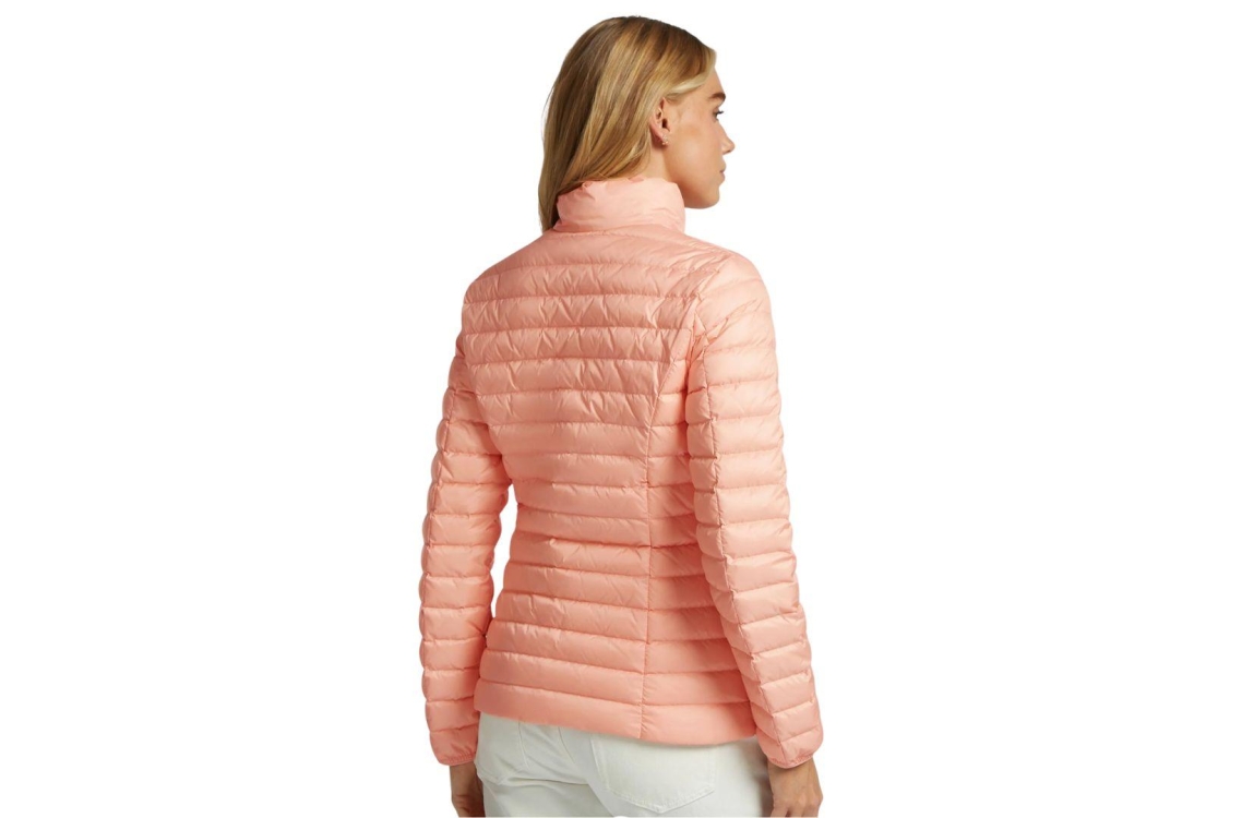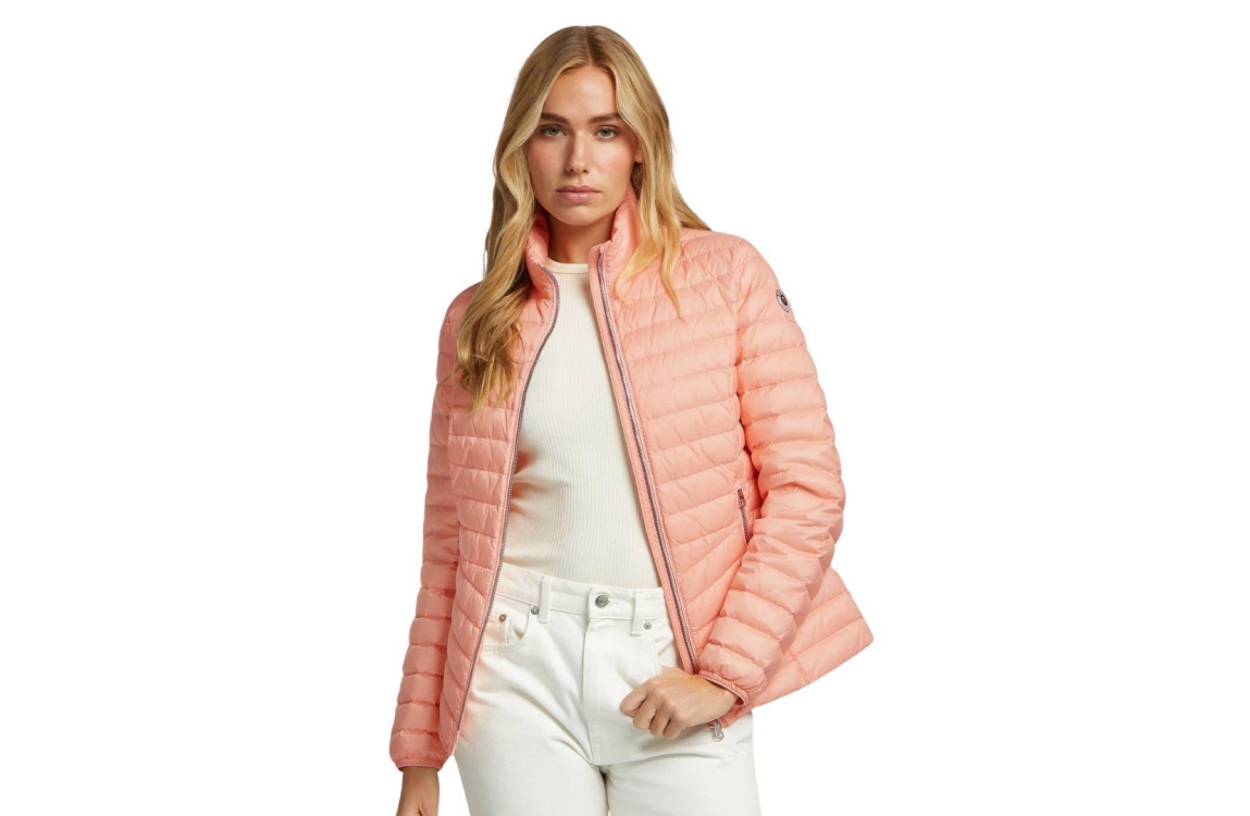 Reset jas Cannes LR02710261 4600. Dit rechtvallende model heeft een opstaande kraag en lange mouwen. Deze peachkleurige jas van Reset sluit aan de voorzijde door middel van een tweezijdige ritssluiting en heeft elastische manchetten. Het model is voorzien van twee ritszakken en beschikt over een zakje om de jas in op te vouwen.