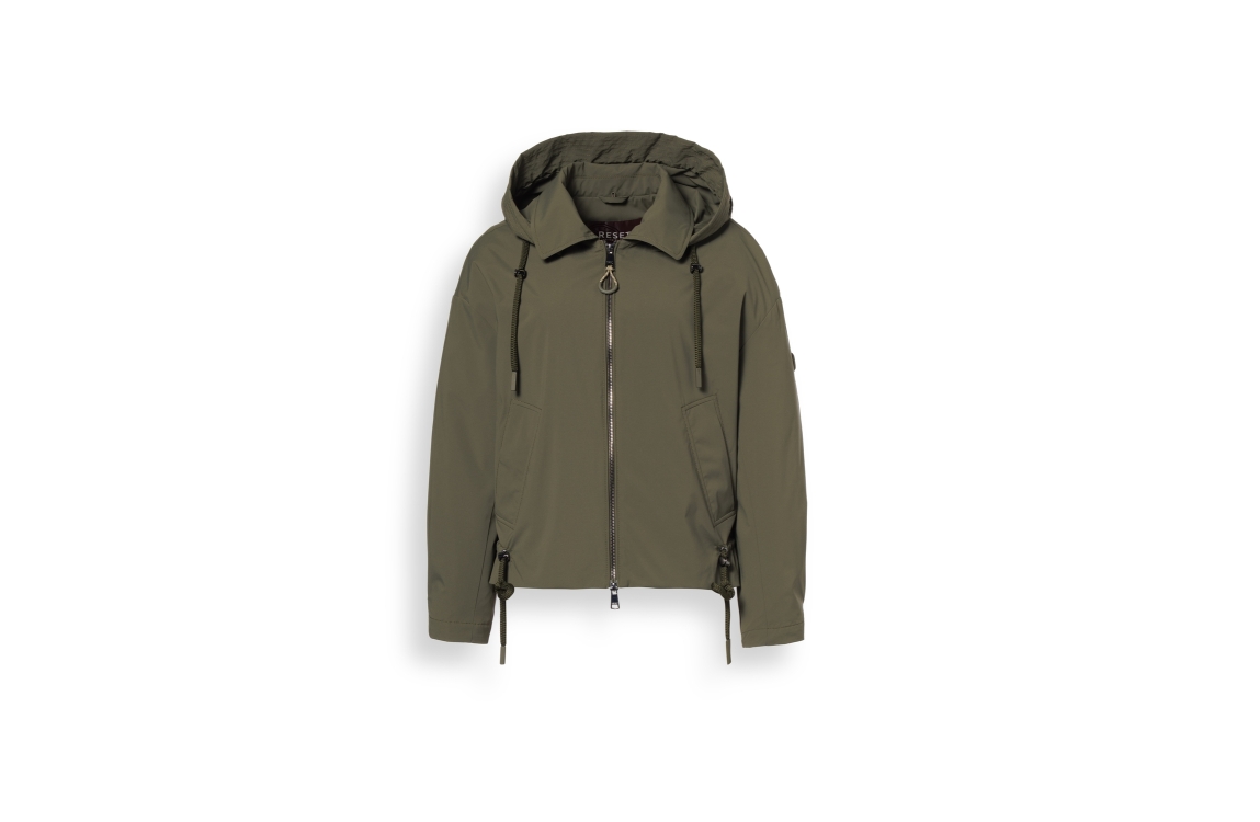 Reset jas LR00211261 6360. Dit sportieve model heeft een afneembare capuchon met trekkoord en lange mouwen. Deze donkergroene jas van Reset sluit aan de voorzijde door middel van een rits en is voorzien van twee schuine steekzakken. Het model is afgewerkt met een elastische zoom met trekkoord.