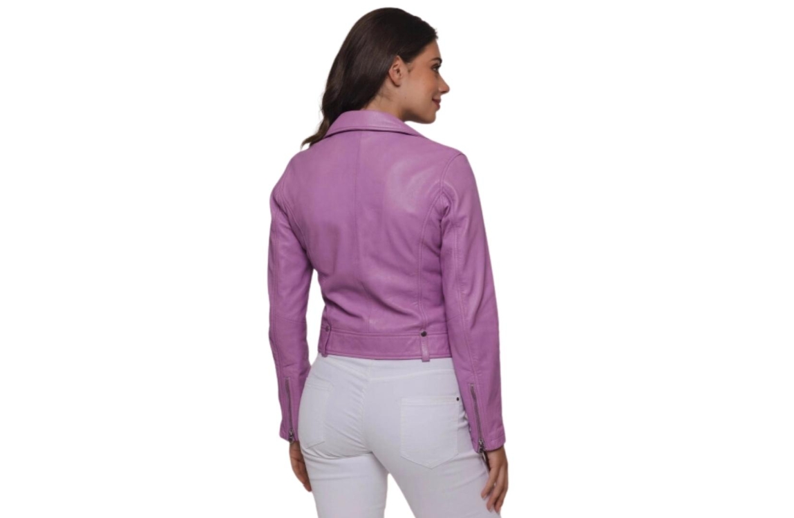 Rino en Pelle jasje Elora 3002420. Dit rechtvallend model heeft een reverskraag en lange mouwen. Deze paarse leren jas van Rino en Pelle sluit aan de voorzijde door middel van een rits en beschikt over twee ritszakken. De mouwen zijn afgewerkt met een rits.