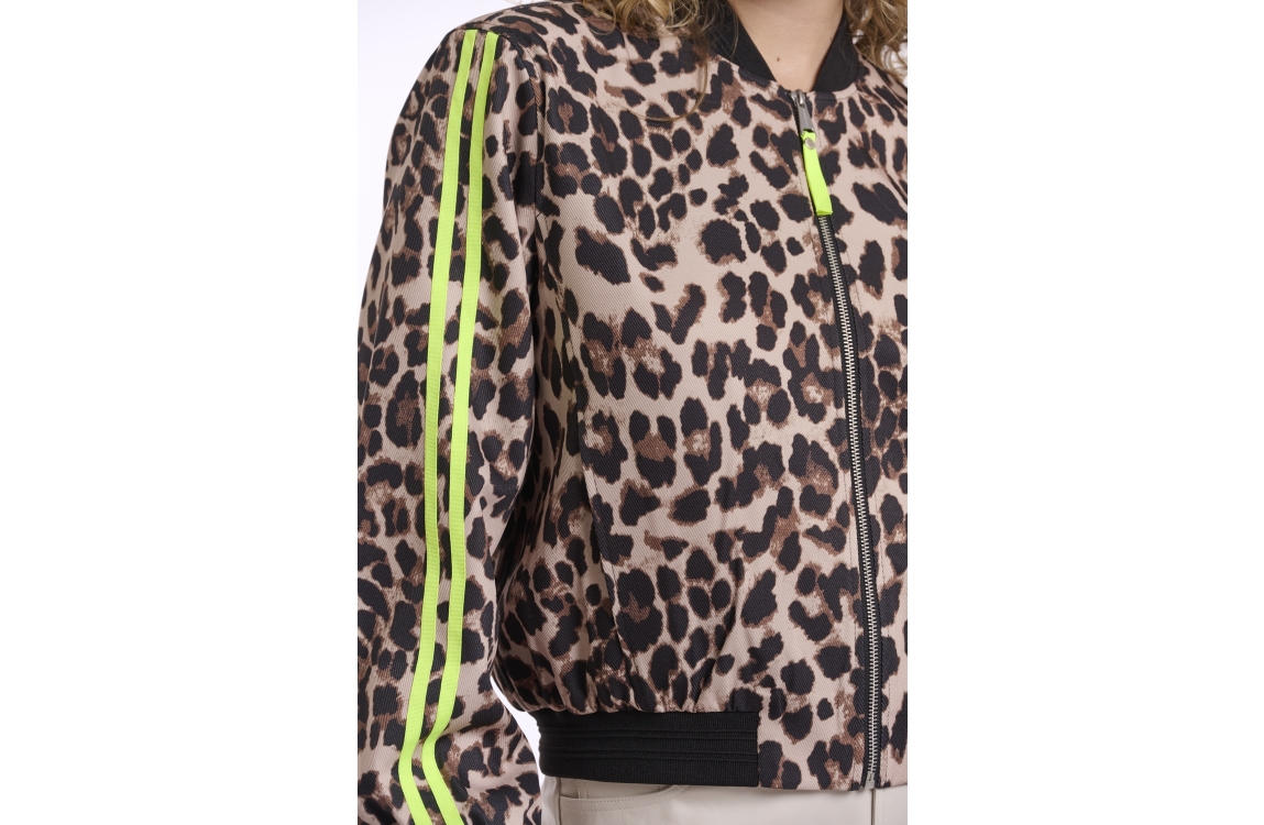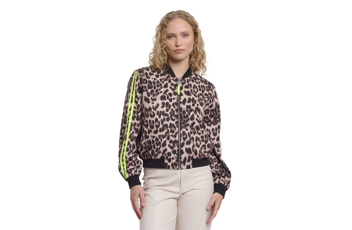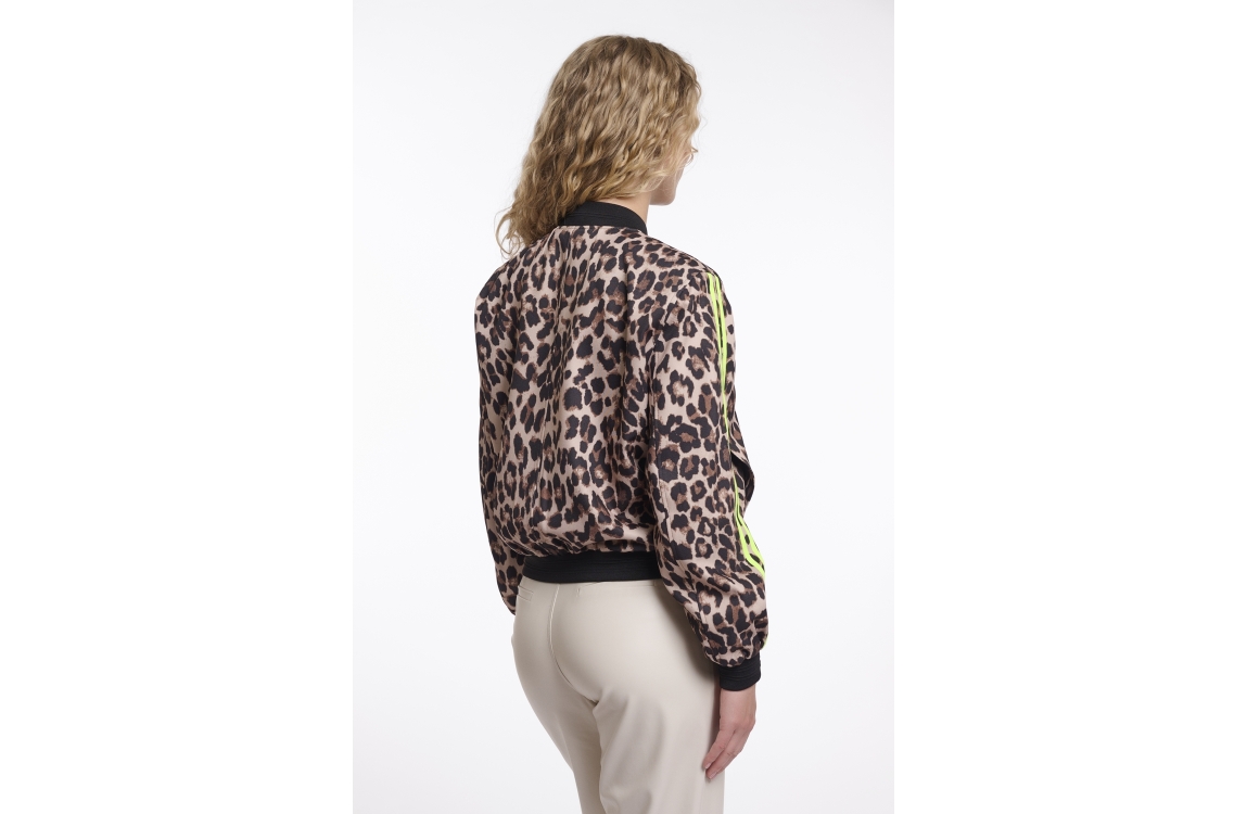 Rino en Pelle Bomber jacket 11032 leopard neon. Dit bomber model is voorzien van een ronde hals en heeft lange mouwen. Deze luipaardprint bomber sluit door middel van rits, heeft steekzakken en is op de mouw bewerkt met een neon bies. Dit model heeft elastische ribboorden aan de kraag, manchetten en zoom.