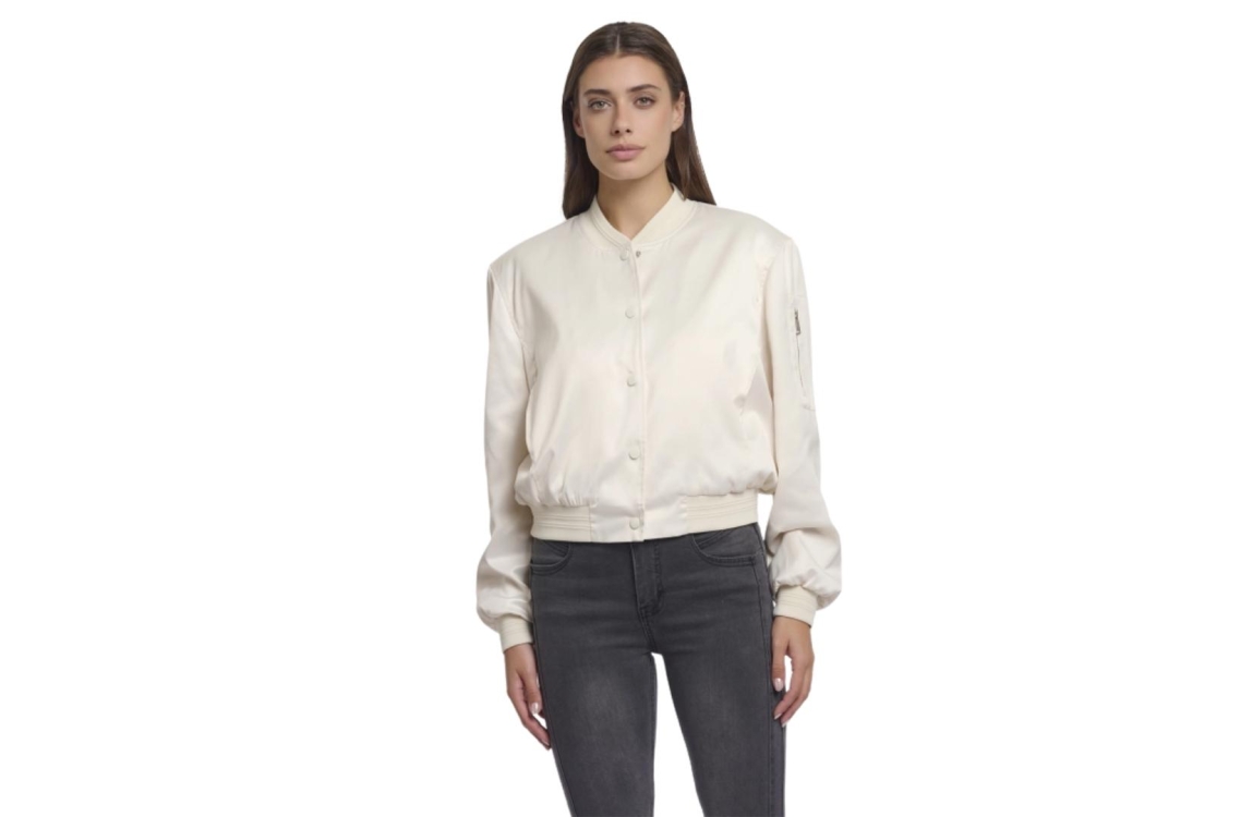 Rino & Pelle Bomber jack Banner.7002521. Dit bomber model is voorzien van een ronde hals en heeft lange mouwen. Deze beigekleurige satijnen bomber sluit door middel van drukknopen, heeft steekzakken en een zakje met rits op de linkermouw.