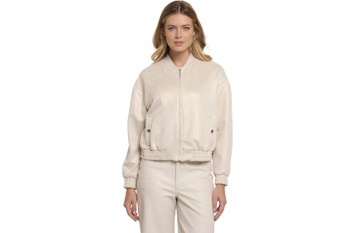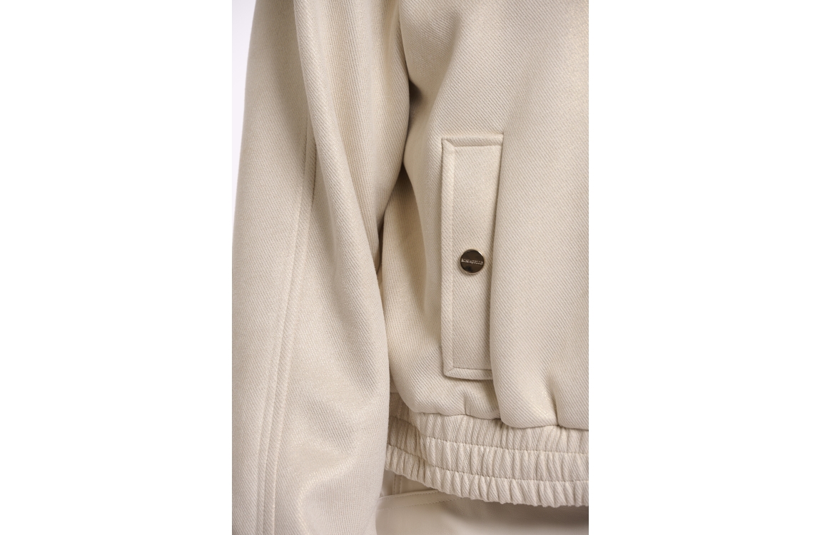 Rino en Pelle Bomber jacket with zipper closure 10828 birch gold. Dit bomber model is voorzien van een ronde hals en heeft lange mouwen. Deze beige bomber sluit door middel van een rits en heeft steekzakken met een drukknoop. Dit model is afgewerkt met boorden en all-over bewerkt met een subtiele glans.