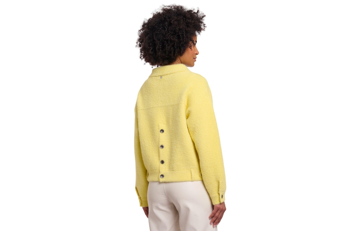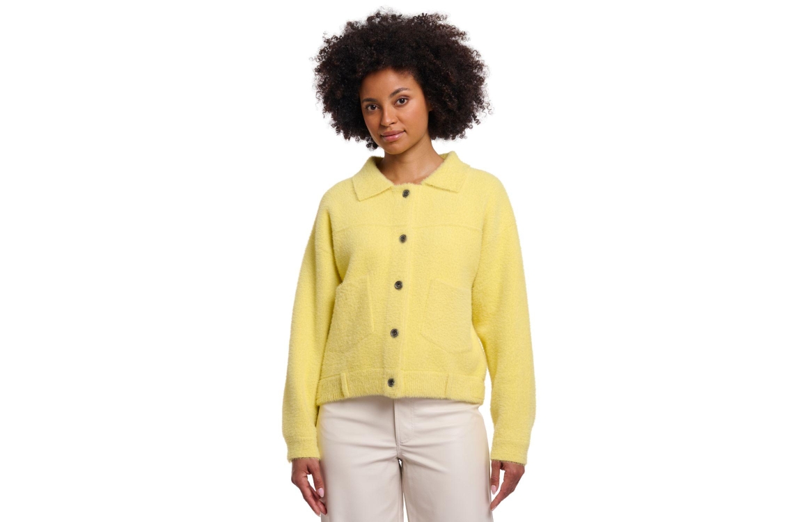 Rino en Pelle vest Bubbly 5002621 11059. Dit rechtvallende model heeft een kraag en lange mouwen. Deze gele vest van Rino en Pelle sluit aan de voorzijde door middel van knopen en is afgewerkt met ribgebreide boorden. Het model is voorzien van twee opgestikte zakken aan de voorzijde en is aan de achterzijde gedetailleerd met knoopdetails. Het model is uitgevoerd in faux fur kwaliteit.