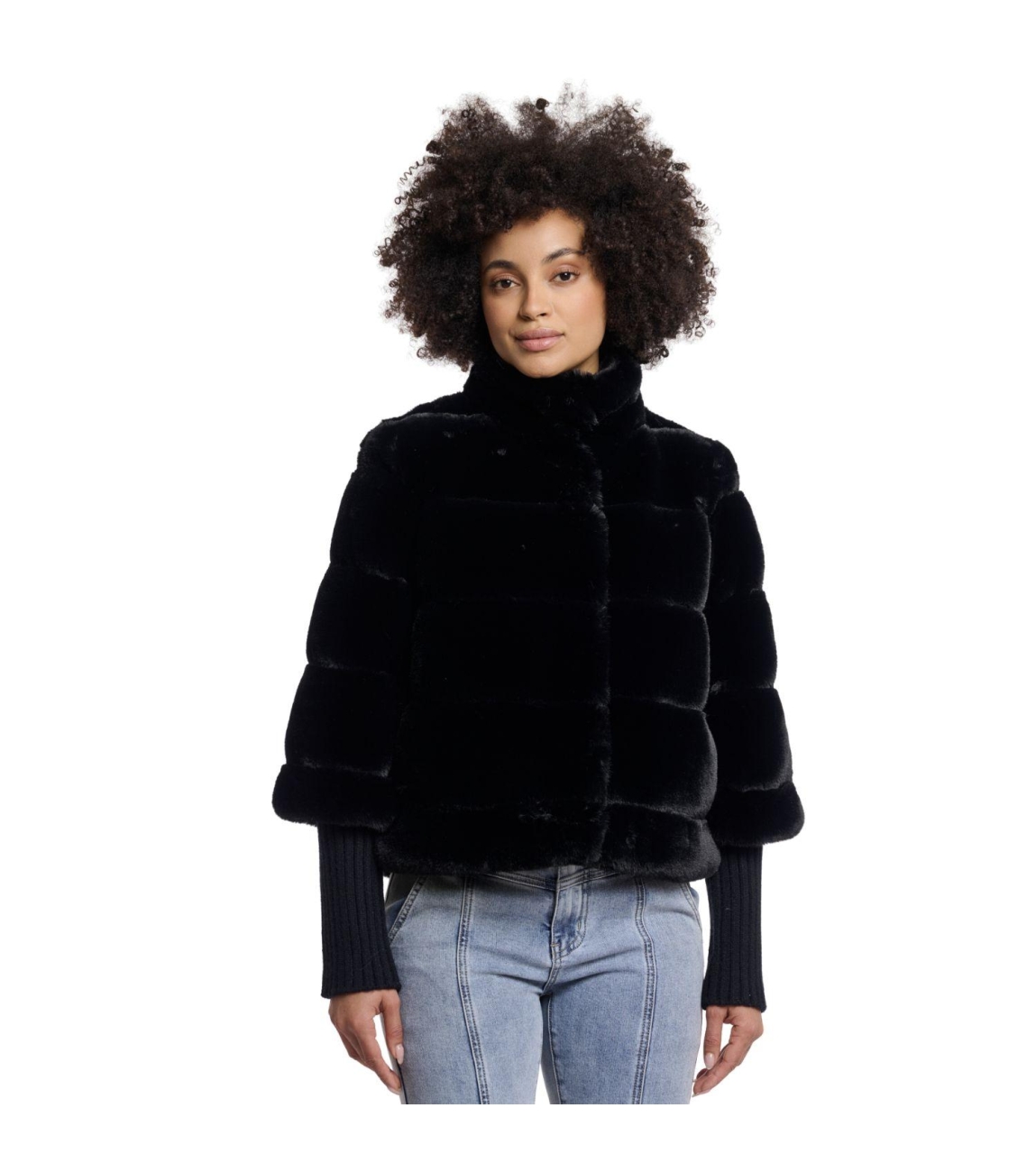 Rino & Pelle faux fur jas Feline 7002512 10000. Dit korte model heeft een kraag en lange mouwen met ribgebreide boorden. De zwarte faux fur jas van Rino & Pelle sluit aan de voorzijde met knopen en is voorzien van twee schuine steekzakken.