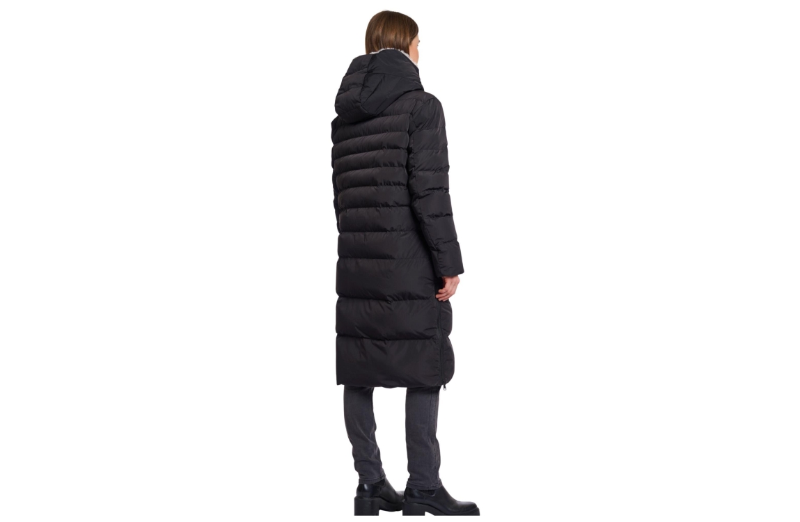 Rino en Pelle jas Keilafur 7002511 10793. Dit rechtvallende model heeft een capuchon en lange mouwen. Deze zwarte jas van Rino en Pelle sluit aan de voorzijde door middel van een ritssluiting en is voorzien van twee knoopzakken. Het model is gedetailleerd met faux fur stof aan de binnenkant en is afgewerkt met ritsen in de zoom.