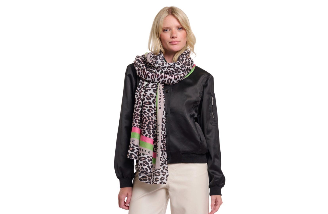 Rino en Pelle sjaal Klaartje 7002621 8980. Dit rechthoekig model is all-over bewerkt met een leopardprint in verschillende kleuren. Deze sjaal van Rino en Pelle is gedetailleerd met het merkembleem en streepprint.