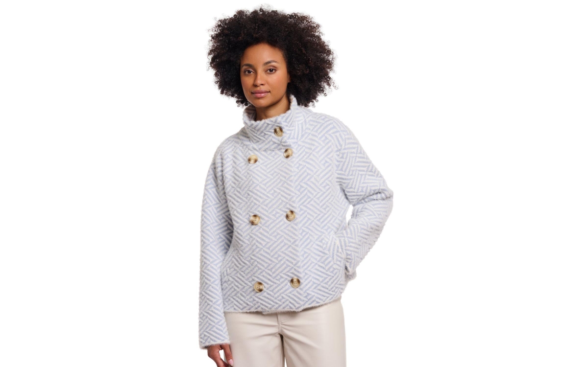 Rino en Pelle jasje Beth 5012621 11064. Dit rechtvallende model heeft een kraag, lange mouwen en is uitgevoerd in faux fur kwaliteit. Het lichtblauwe model is all-over bewerkt met een zigzagprint en sluit aan de voorzijde door middel van knopen. Het model is voorzien van twee steekzakken en is afgewerkt met ribgebreide boorden en sierknopen.