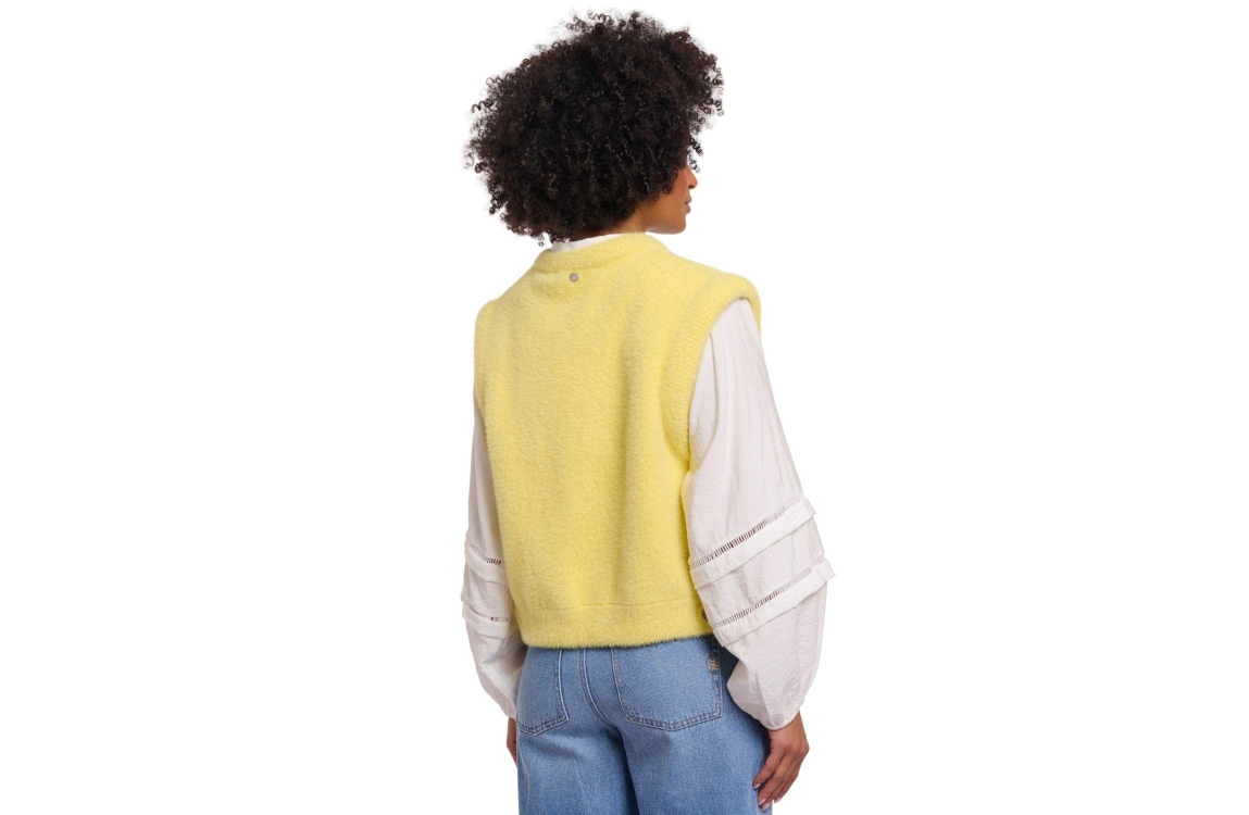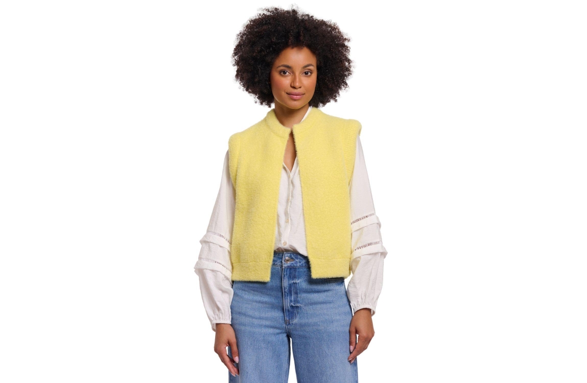 Rino en Pelle gilet Elona 5002621 11059. Dit rechtvallende model heeft een ronde halslijn en is mouwloos. Deze gele gilet van Rino en Pelle is uitgevoerd in faux fur kwaliteit en is afgewerkt met ribgebreide boorden.
