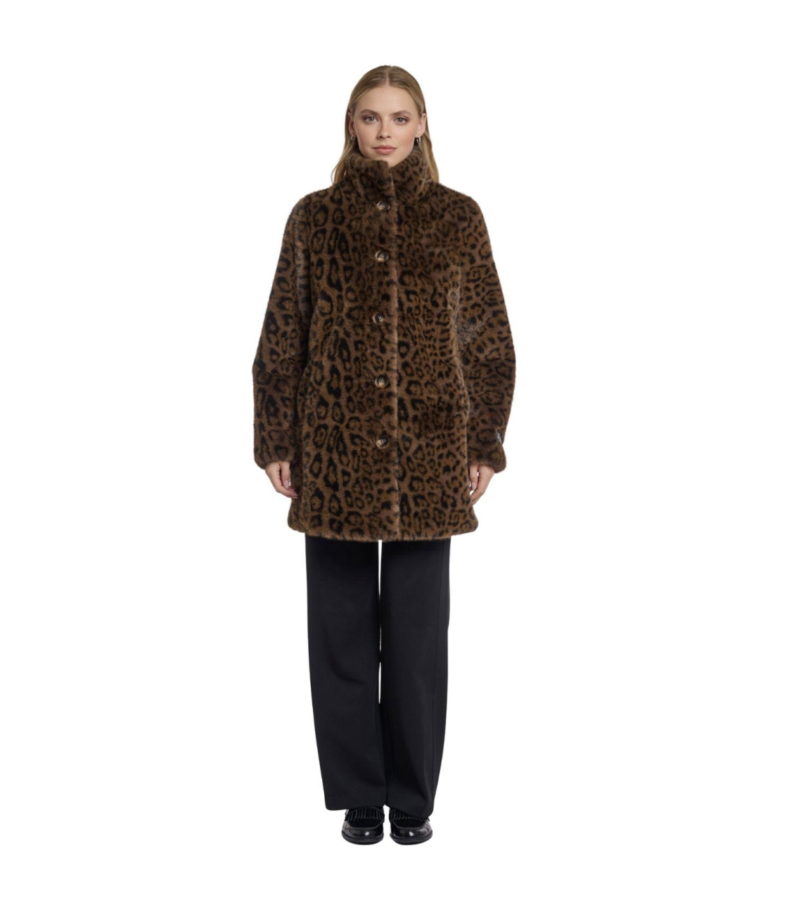 Rino en Pelle jas Nonna 7012511 8980. Dit rechtvallende model heeft een opstaande kraag en lange mouwen. Deze donkerbruine jas van Rino & Pelle is all-over bewerkt met een leopardprint en sluit aan de voorzijde met knopen. Het model is voorzien van twee steekzakken en is uitgevoerd in fake fur-kwaliteit.