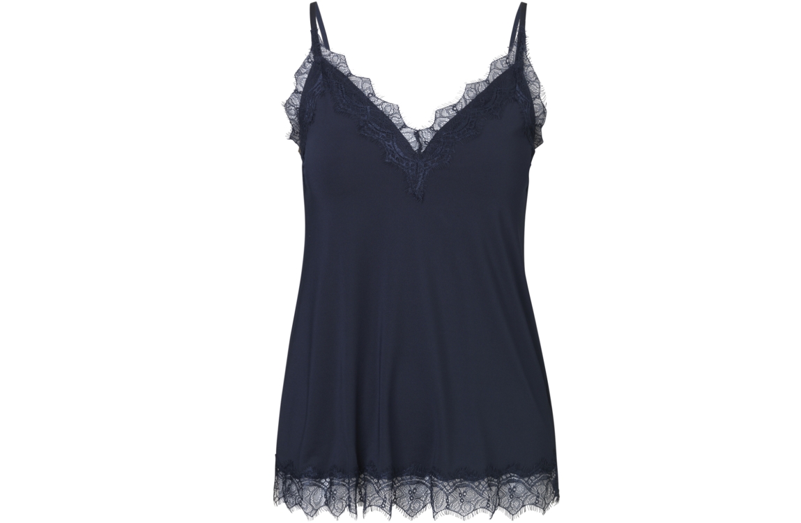 Rosemunde top 4217-192. Dit recht vallende model is voorzien van een v-hals en is mouwloos. Deze donkerblauwe top van Rosemunde bevat veel stretch en is afgewerkt met kant.
