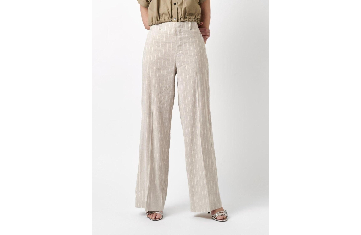 Rosner broek Mara. Dit wide leg model sluit door middel van een elastische boord en beschikt over twee steek- en paspelzakken. Deze zandkleurige broek van Rosner is bewerkt met strepen.