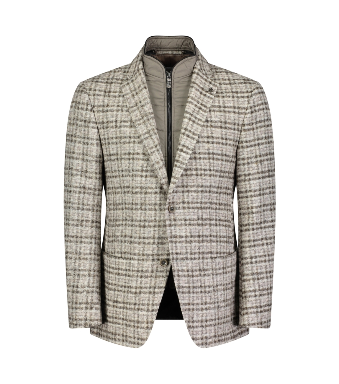 Roy Robsen colbert Sakkos 000155441374200. Dit rechtvallende model heeft een reverskraag en lange mouwen. Dit bruine colbert van Roy Robson sluit aan de voorzijde met een rits en knoopsluitingen. Het model is all-over bewerkt met een blokpatroon in verschillende kleuren en is voorzien van twee opgestikte zakken. Dit colbert is afgewerkt met een sportieve, decoratieve onderjas met een ronde halslijn.