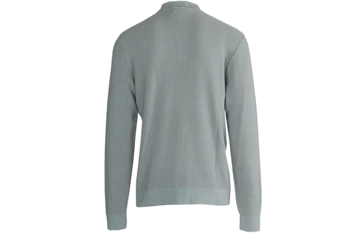 Saint Steve trui 241297. Dit rechtvallend model is voorzien van een kraag en heeft lange mouwen. Deze groene pullover van Saint Steve sluit aan de bovenzijde door middel van knopen en is allover uitgevoerd met een structuur.