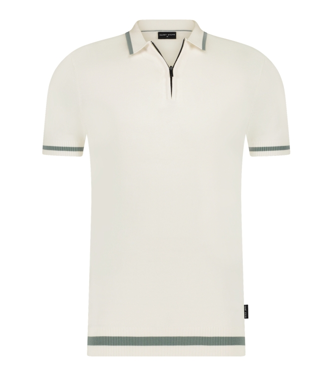 Saint Steve poloshirt Siem 221148. Dit aangesloten model is voorzien van een openstaande kraag. Deze witte polo sluit aan de bovenzijde doormiddel van een rits. Dit model is afgewerkt met aangesloten boorden en bewerkt met groene bies .