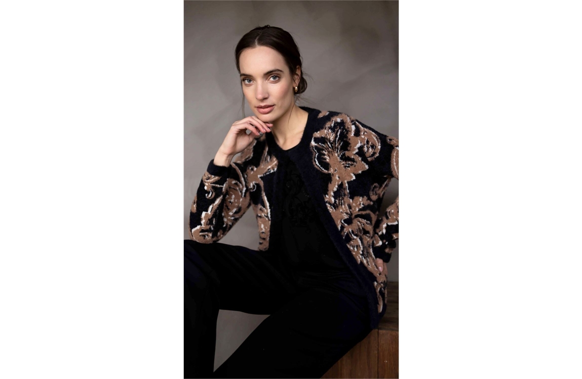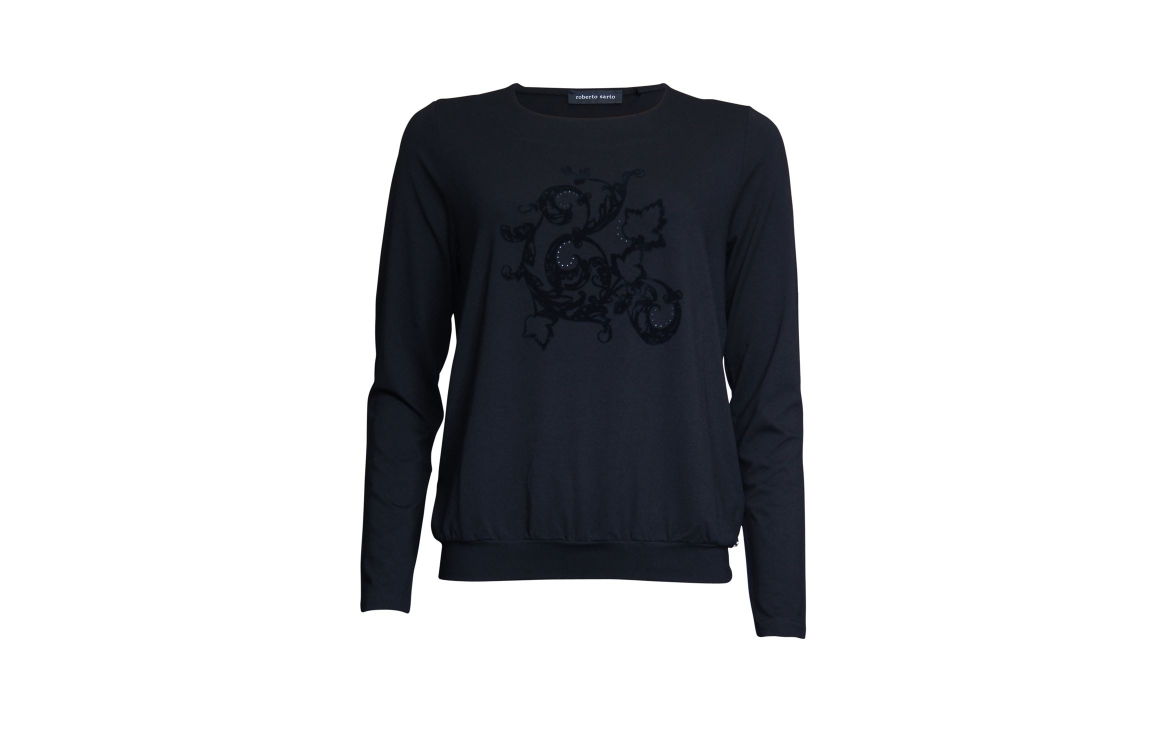 Roberto sarto fashion blouson ballet neck. Dit rechtvallend model heeft een ronde hals en lange mouwen. Deze zwarte blouses van Roberto Sarto is bijwerkt met bloemen op de voorzijde.