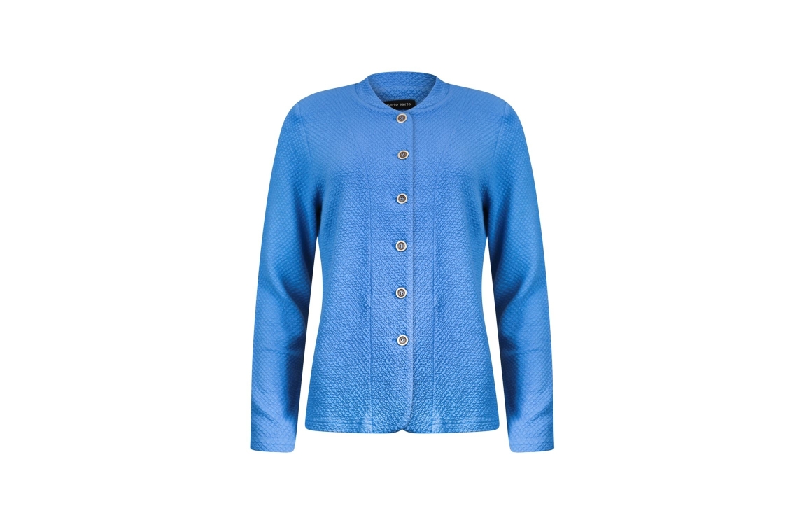 Roberto Sarto fashion jacket 511150. Dit rechtvallend model heeft een kraag en lange mouwen met schoudervulling. Deze blauwe gestructureerde jacket van Roberto Sarto sluit door middel van knoopjes.