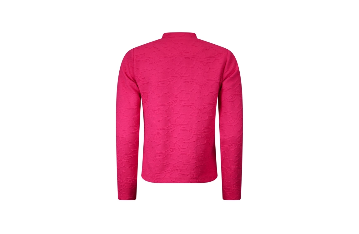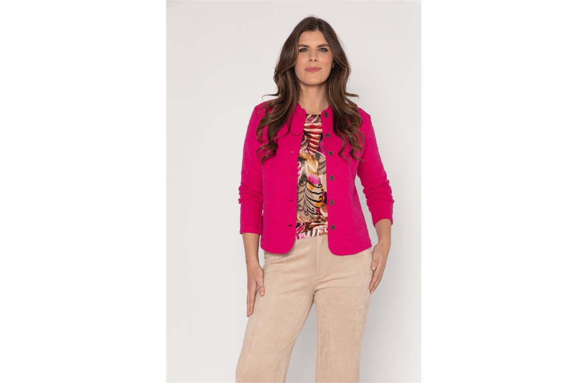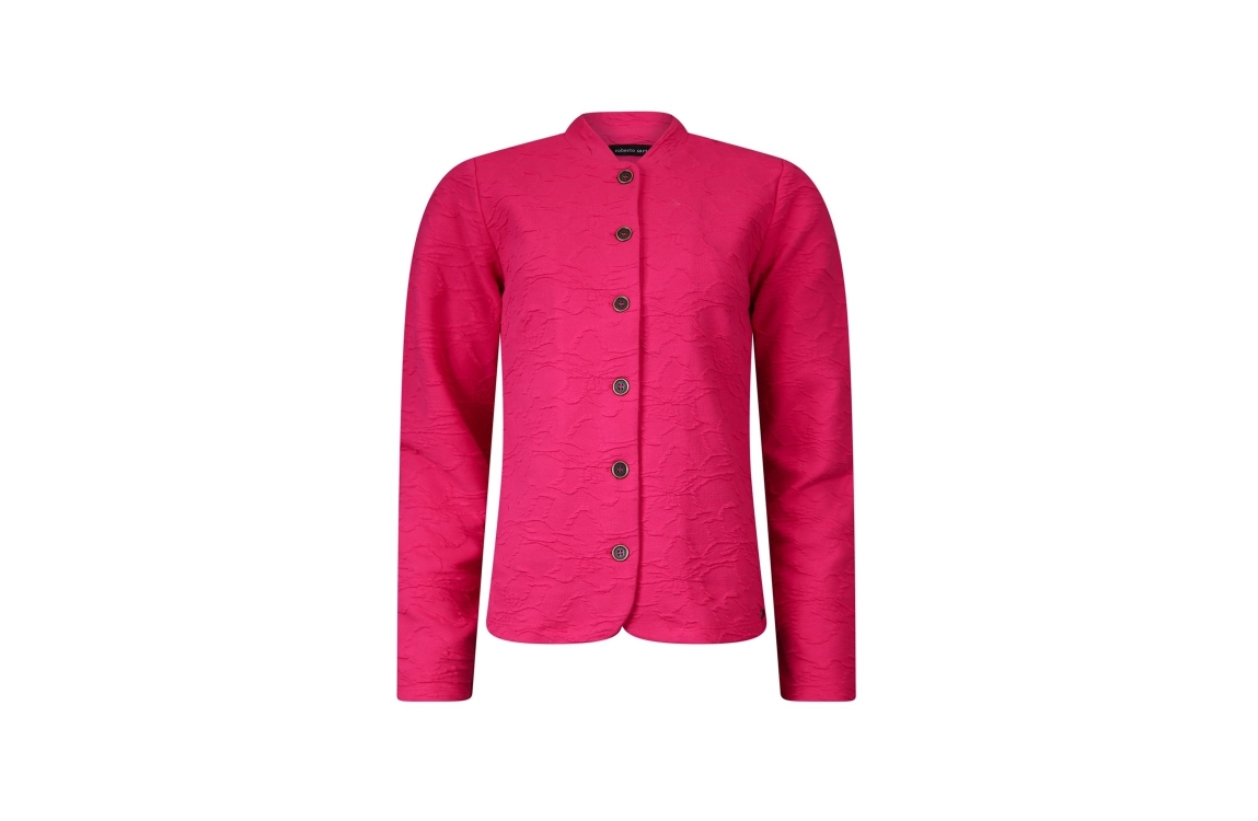 Roberto Sarto jasje 611110. Dit rechtvallende model is voorzien van een ronde hals en heeft lange mouwen. Dit fuchsia kleurige jasje van Roberto Sarto sluit aan de voorzijde door middel van knopen. Dit model is bewerkt met een geborduurde bloemenpatroon.