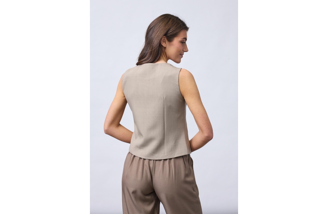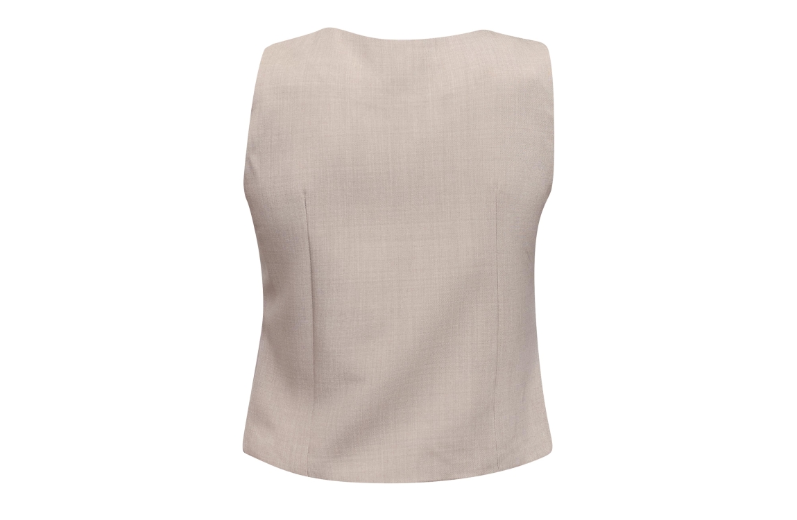Sisters Point Vest 205 Sand. Dit rechtvallende model is voorzien van een ronde hals en is mouwloos. Dit beige gilet van Sisters Point sluit door middel van knopen aan de voorzijde