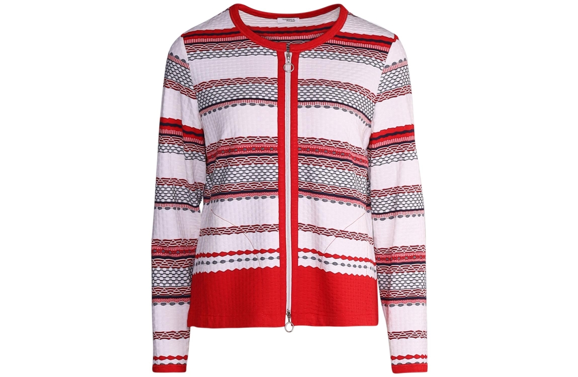 Sommermann jasje Cassandra 4554-11. Dit rechtvallend model heeft een ronde hals en lange mouwen. Deze rode jas van Sommermann sluit aan de voorzijde door middel van een rits en is all-over bewerkt met verschillende patronen en kleuren. Dit model beschikt over twee schuine steekzakken aan de voorzijde.