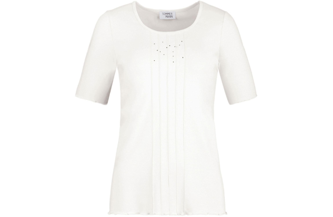 Sommermann top Heike 5002-32. Dit rechtvallend model is voorzien van een ronde/vierkante hals en heeft korte mouwen. Deze witte top van Sommermann is aan de voorzijde bewerkt met verticale naad details afgewerkt met strass steentjes aan de bovenzijde. Dit model is bij de mouwen en aan de onderzijde bewerkt met ruches.