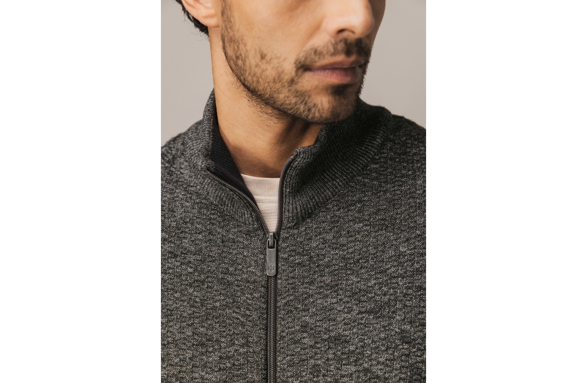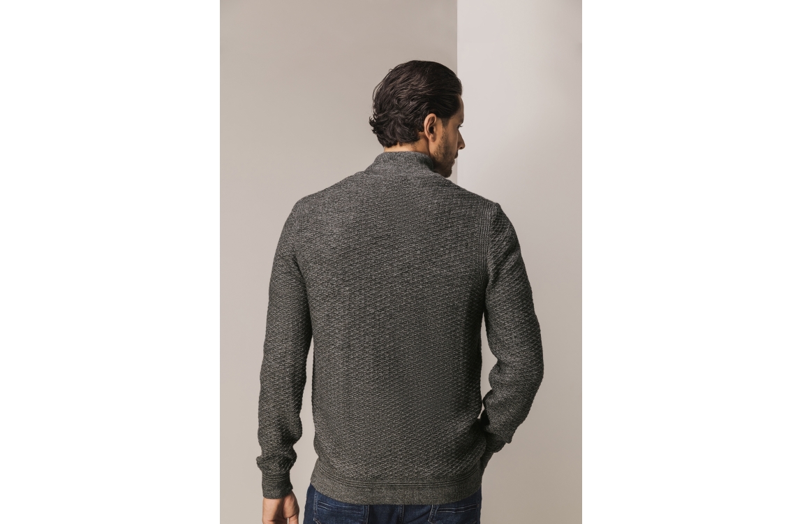 State of Art vest 16125062 9895. Dit rechtvallende model heeft een opstaande kraag en lange mouwen. Deze donkergrijze vest van State of Art sluit aan de voorzijde door middel van een ritssluiting en is uitgevoerd in een grove breisel. Het model is afgewerkt met ribgebreide boorden.
