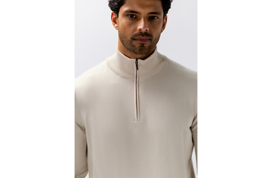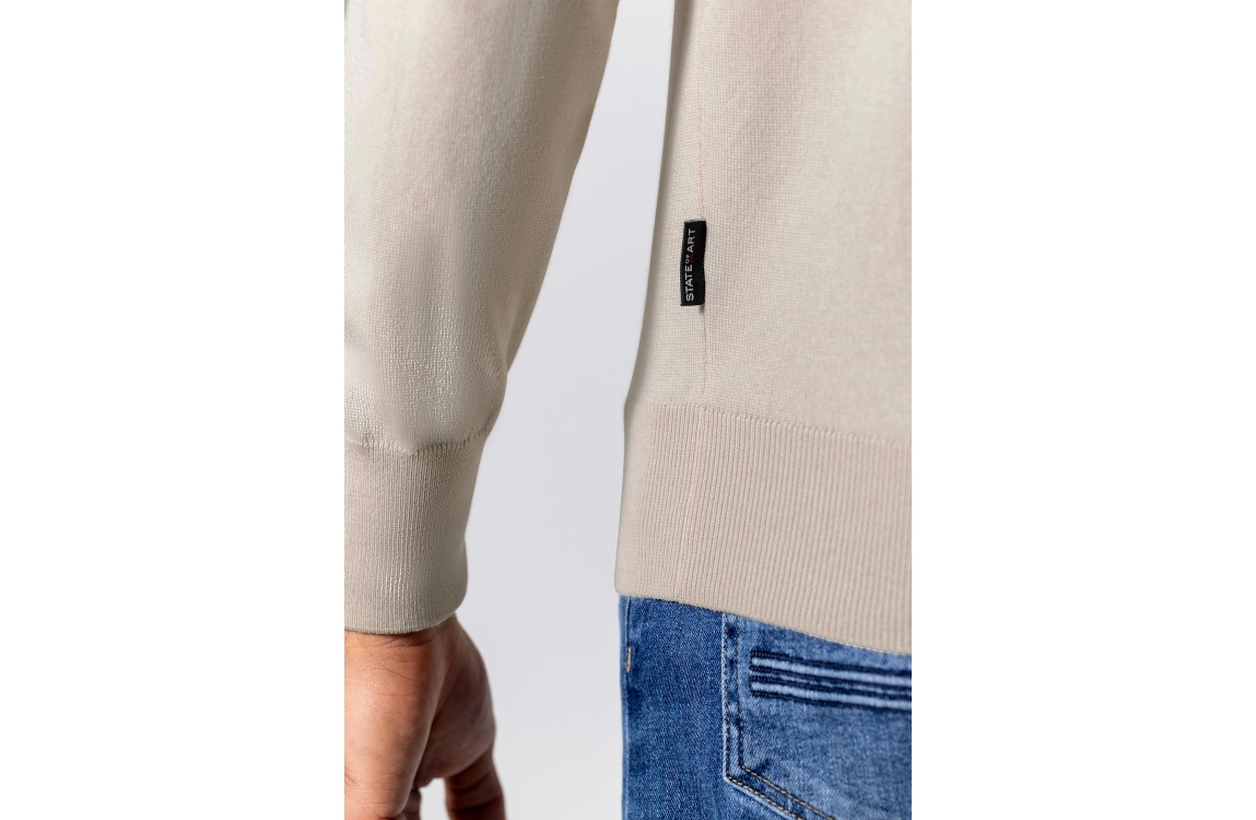 State of Art pullover 13116121. Dit rechtvallend model heeft een opstaande kraag met rits en lang en mouwen. Deze beige pullover van State of Art is voorzien van elastische boorden aan de onderzijde.