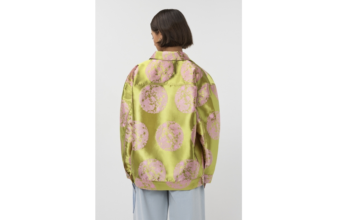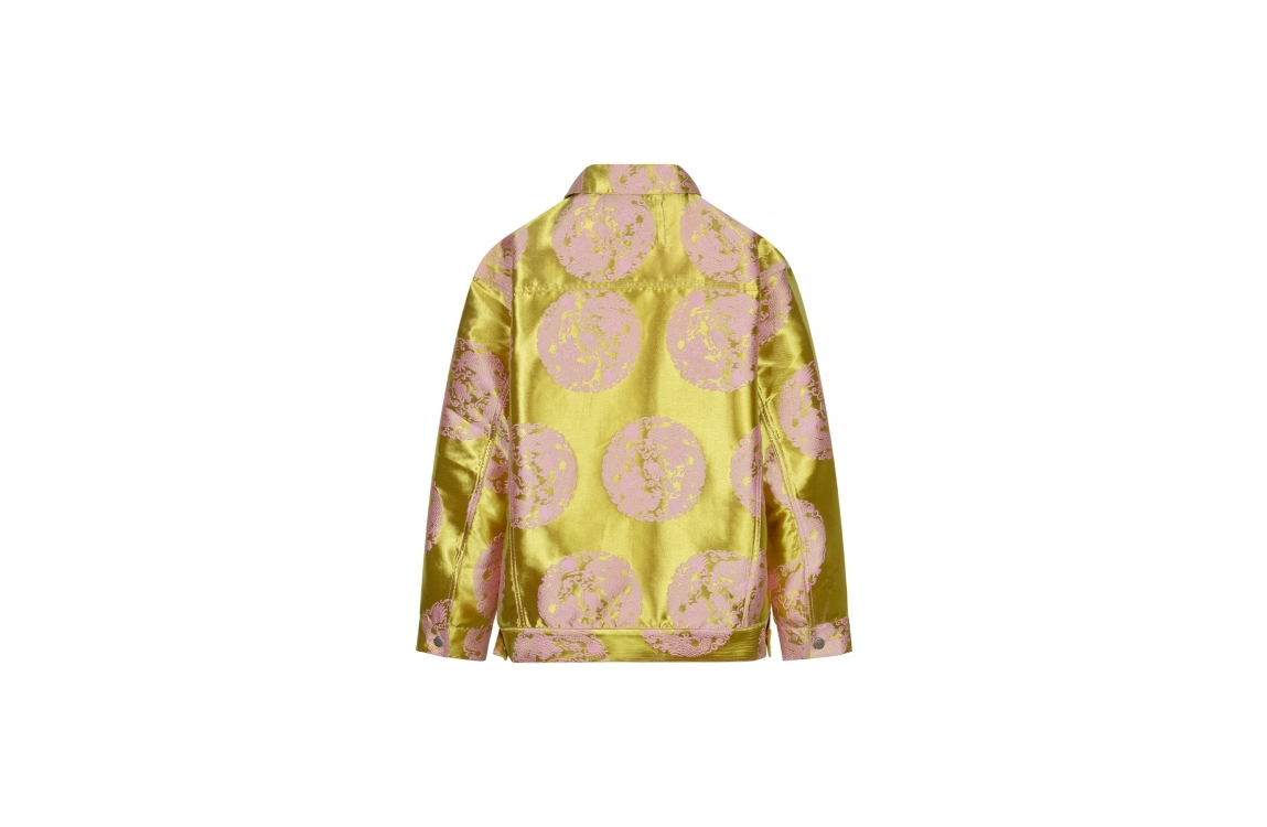 Studio Amaya jasje Joni 261-ST14 650. Dit oversized model heeft een kraag en lange mouwen. Het goudkleurige jasje van Studio Amaya sluit aan de voorzijde door middel van knopen en is all-over bewerkt met een rozekleurige grafische print. Het model is voorzien van twee sluitbare borstzakken en twee decoratieve steekzakken.