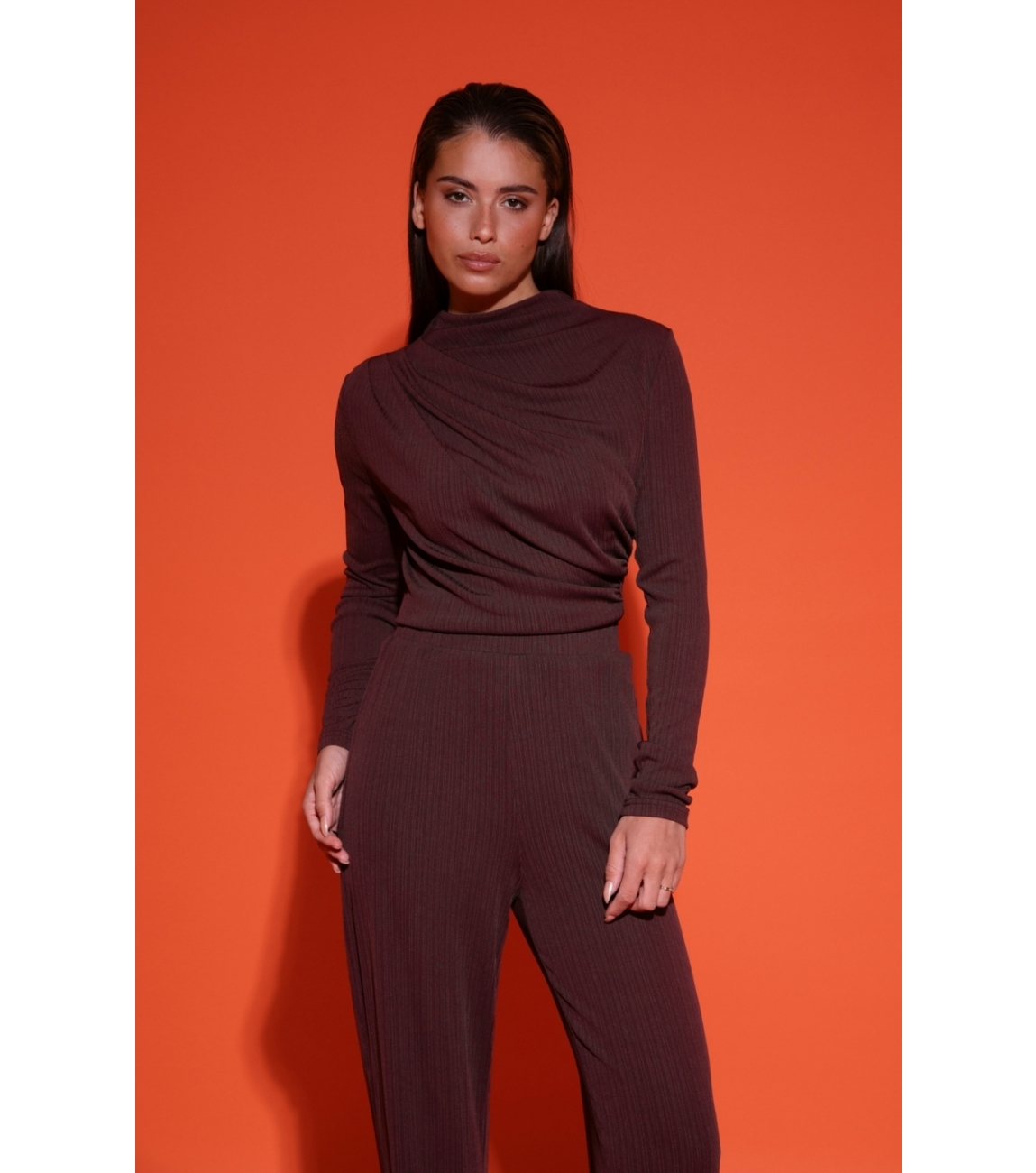 Studio Amaya top Bo 254-51. Dit aangesloten model is voorzien van een hoge ronde hals en heeft lange mouwen. Deze bruine top van Studio Amaya is uitgevoerd in een strech kwaliteit en is afgewerkt met gedrappeerde details.