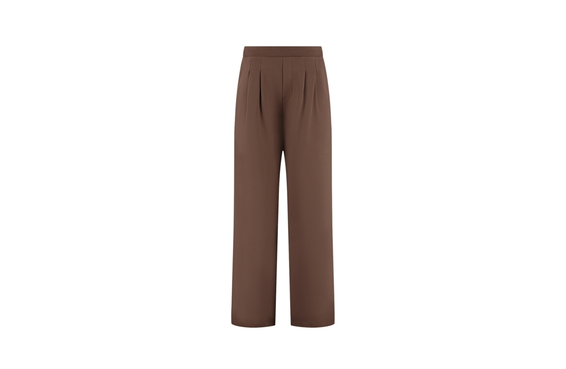 Studio Amaya broek Jasmin 253-52. Dit wide leg model sluit door middel van een elastische boord en beschikt over twee steekzakken aan de voorzijde. Deze bruine broek van Studio Amaya is bewerkt met plooidetails aan de voorzijde. Combineer deze broek met de Puck blazer voor een set.